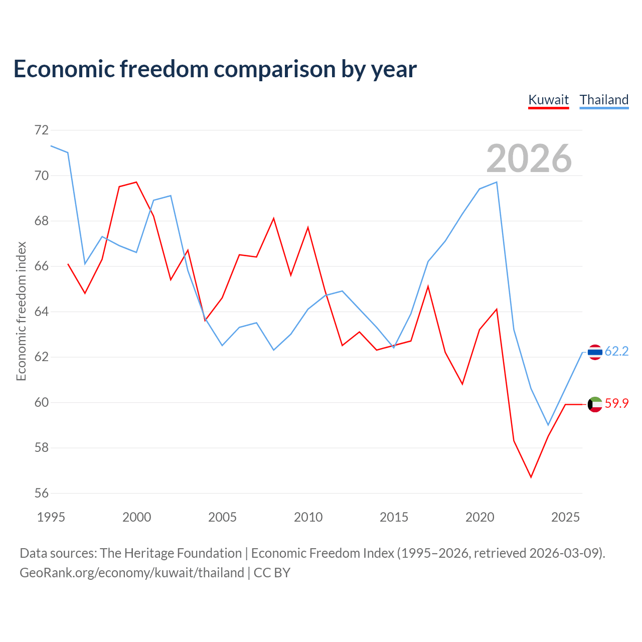 Data sources: The Heritage Foundation | Economic Freedom Index (1995–2026, retrieved 2026-03-09).