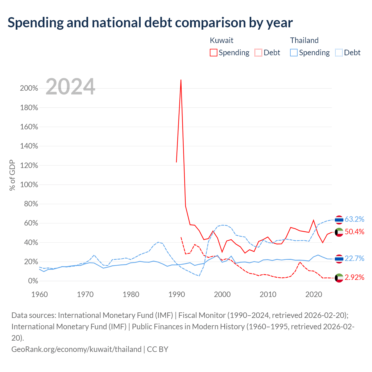 Kuwait has $4.68B in government debt (2.92% of GDP), compared to $333B (63.2% of GDP) in Thailand.
