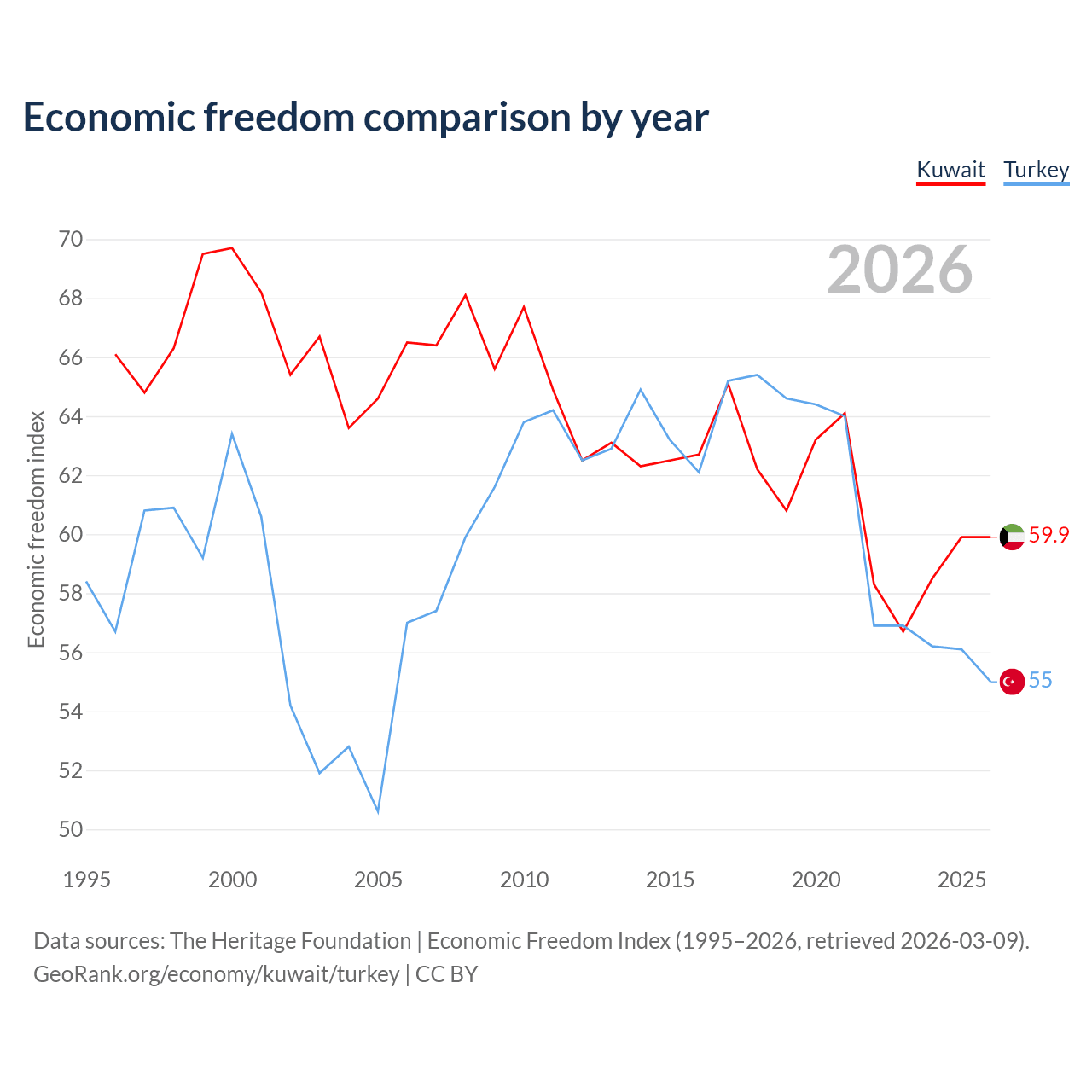 The Economic Freedom Index for Kuwait is 59.9, ranking 100/197, compared to 55 for Turkey, ranking 129/197. The chart above displays a comparison of annual changes in economic freedom indexes.