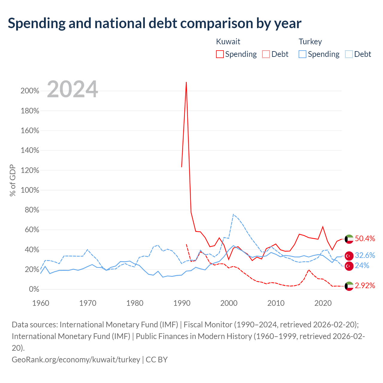 Kuwait has $4.68B in government debt (2.92% of GDP), compared to $327B (24% of GDP) in Turkey.