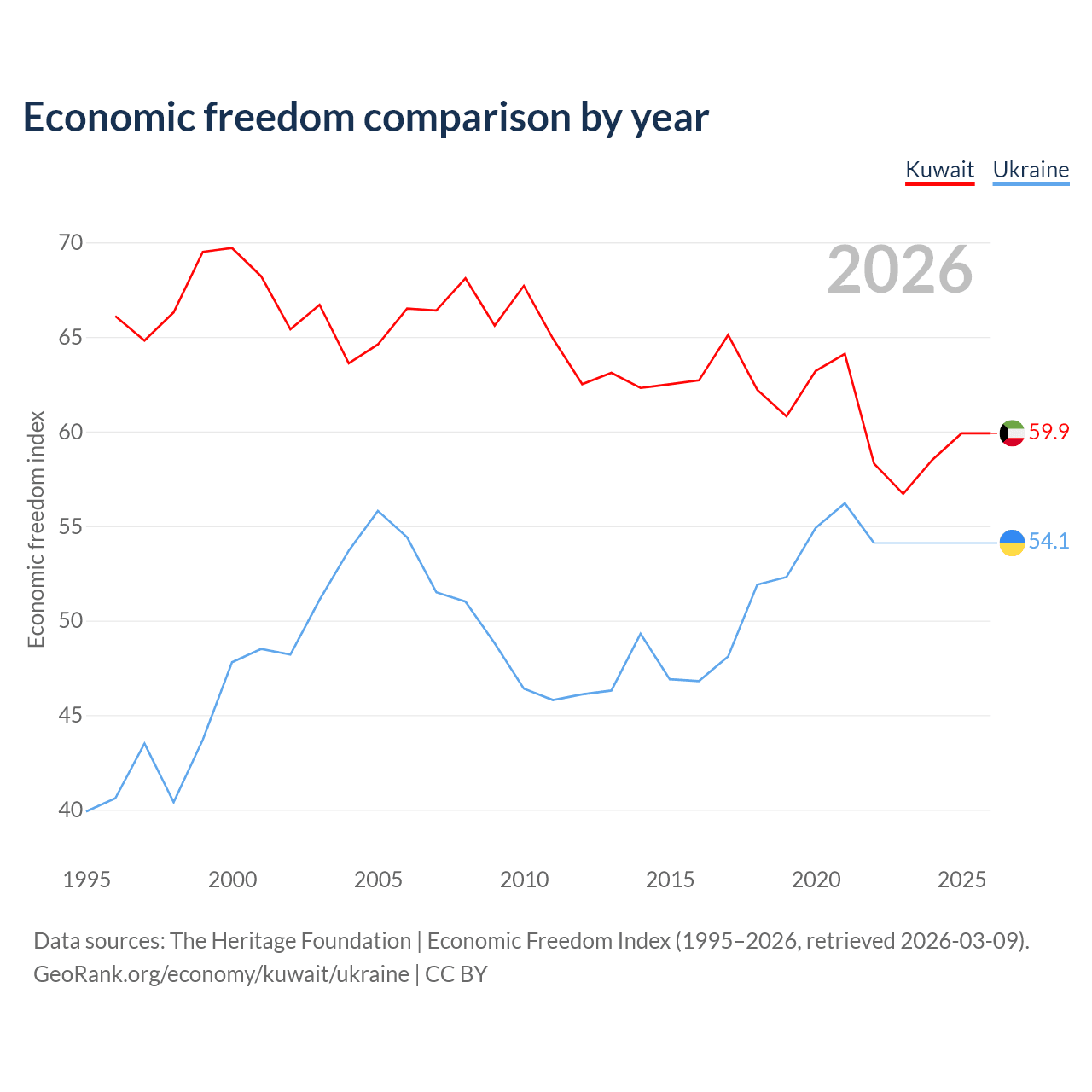 The Economic Freedom Index for Kuwait is 59.9, ranking 100/197, compared to 54.1 for Ukraine, ranking 135/197. The chart above displays a comparison of annual changes in economic freedom indexes.