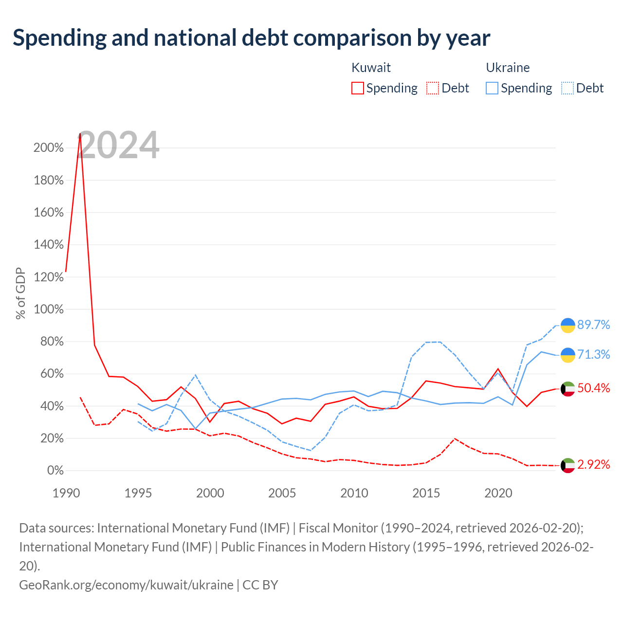 Kuwait has $4.68B in government debt (2.92% of GDP), compared to $171B (89.7% of GDP) in Ukraine.