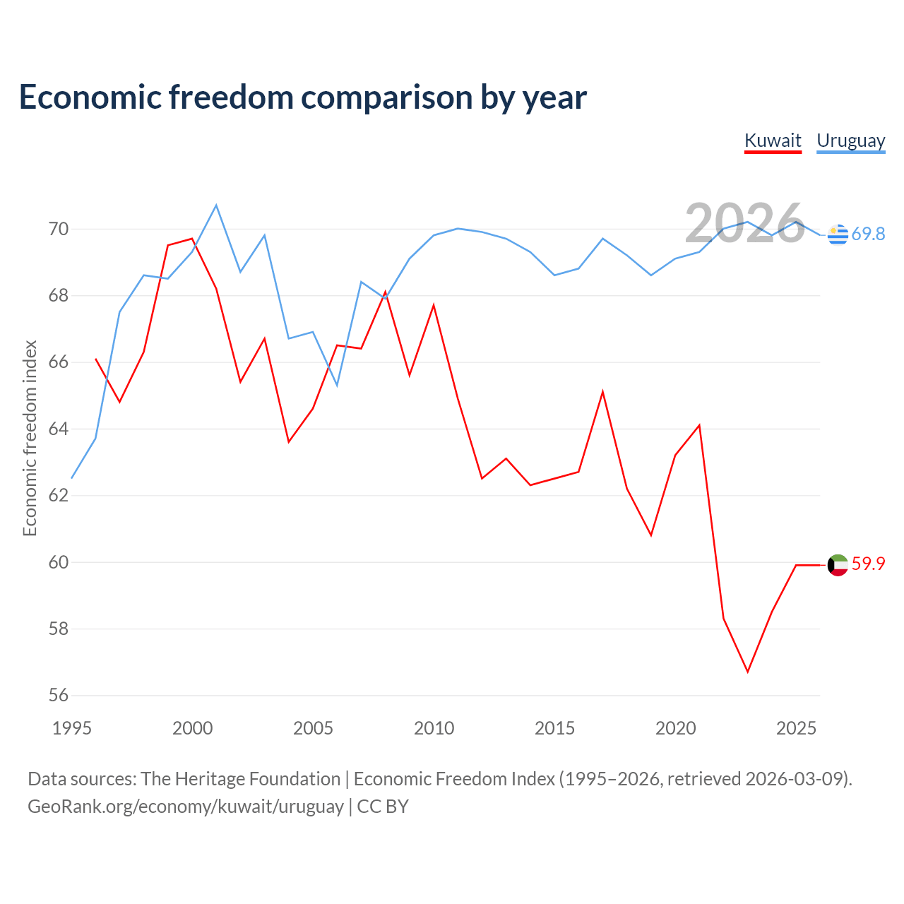 The Economic Freedom Index for Kuwait is 59.9, ranking 100/197, compared to 69.8 for Uruguay, ranking 39/197. The chart above displays a comparison of annual changes in economic freedom indexes.