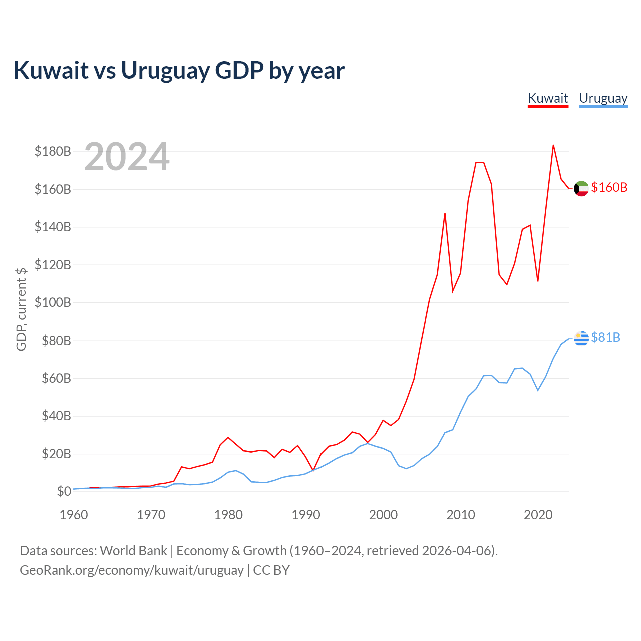 Kuwait has a GDP of $160B compared to $81B for Uruguay, ranking 59/197 and 81/197 by economy size, respectively.