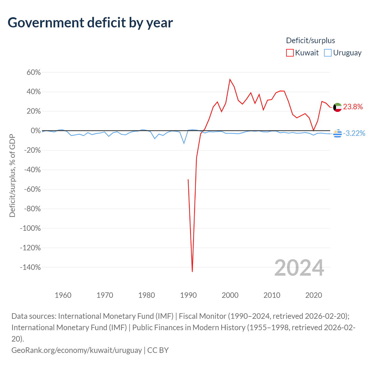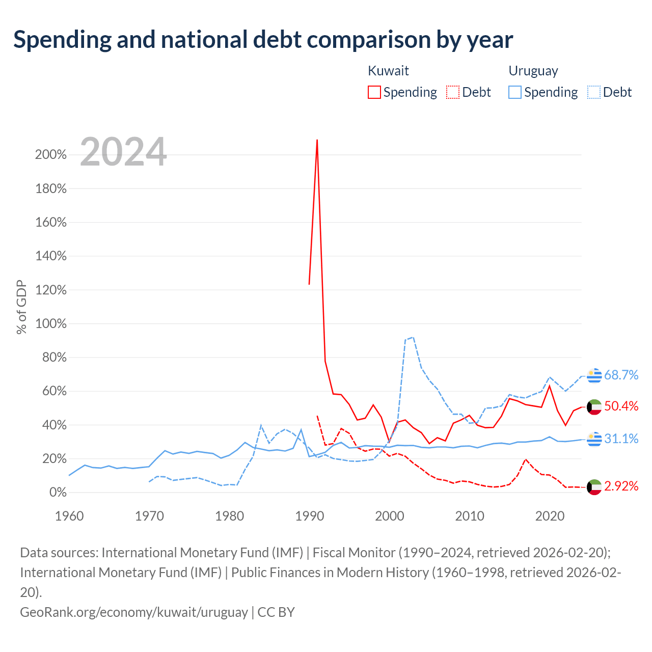 Kuwait has $4.68B in government debt (2.92% of GDP), compared to $55.6B (68.7% of GDP) in Uruguay.