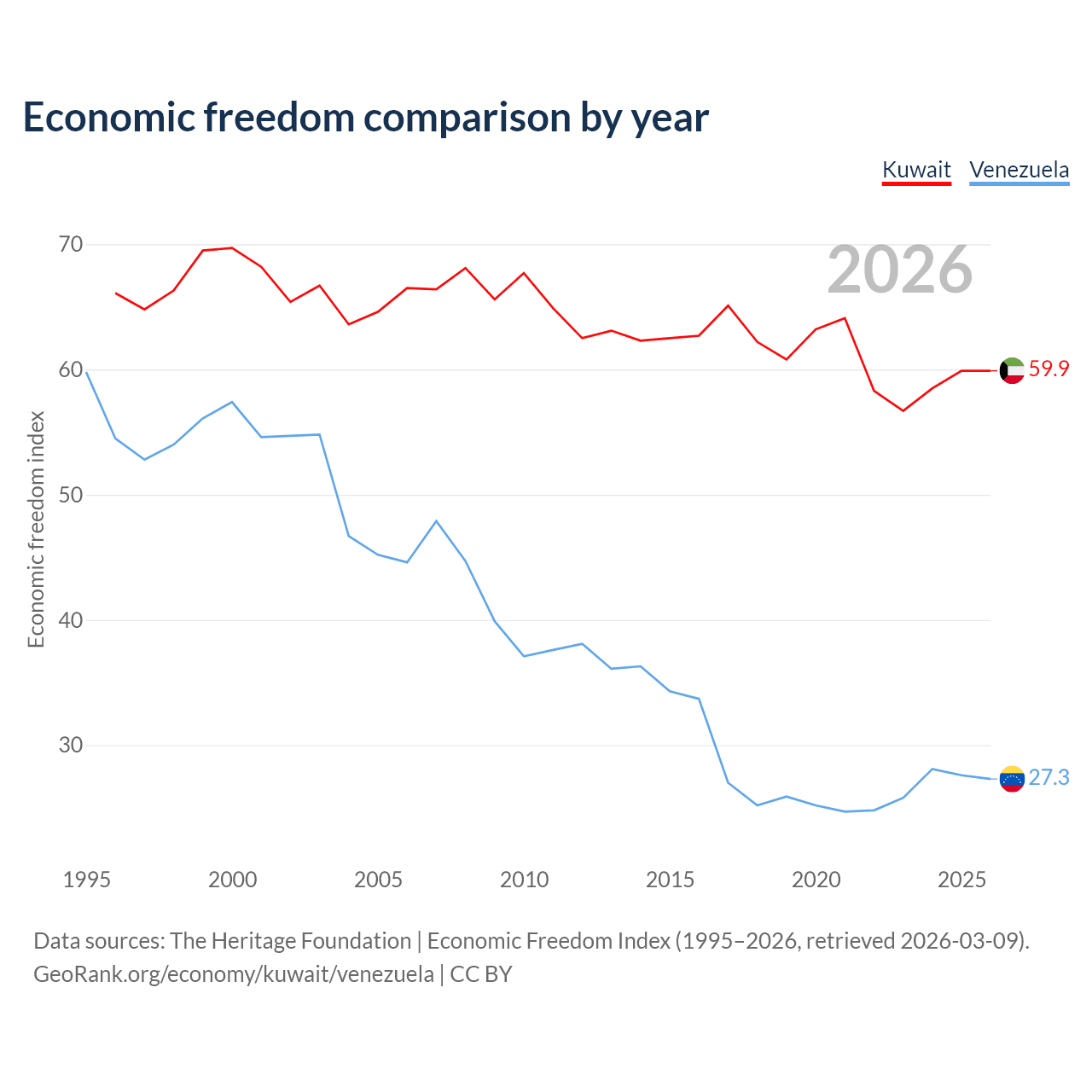 The Economic Freedom Index for Kuwait is 59.9, ranking 100/197, compared to 27.3 for Venezuela, ranking 194/197. The chart above displays a comparison of annual changes in economic freedom indexes.