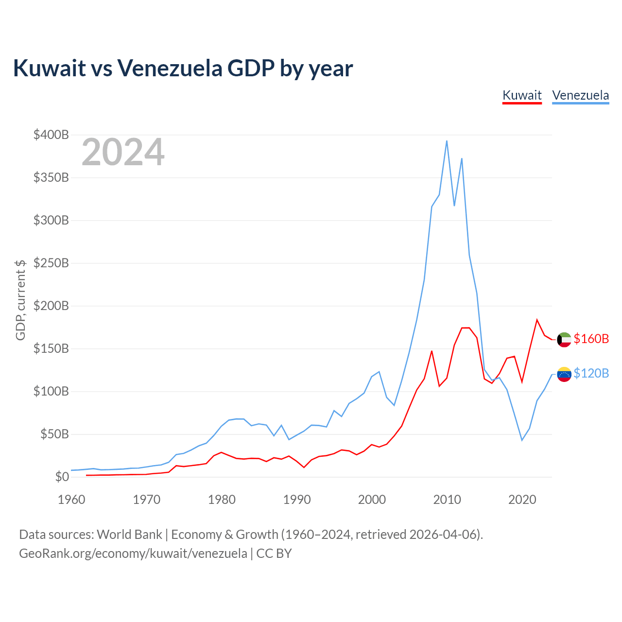 Kuwait has a GDP of $160B compared to $120B for Venezuela, ranking 59/197 and 65/197 by economy size, respectively.