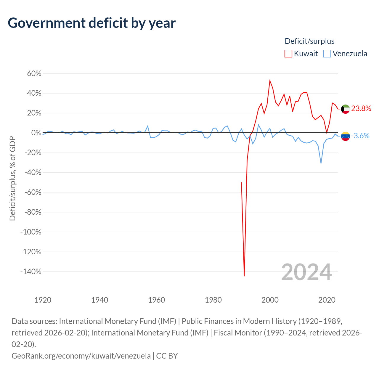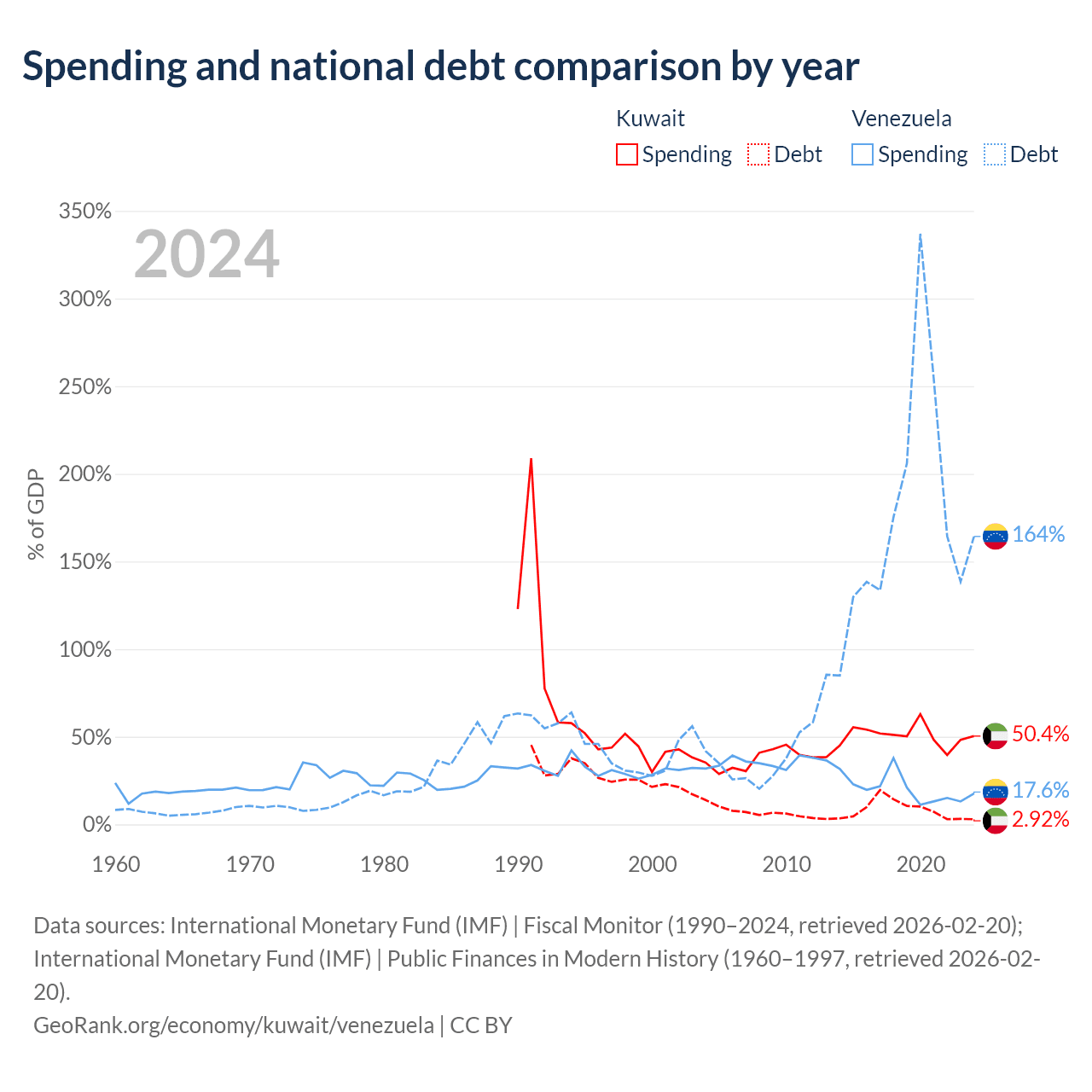 Kuwait has $4.68B in government debt (2.92% of GDP), compared to $197B (164.3% of GDP) in Venezuela.