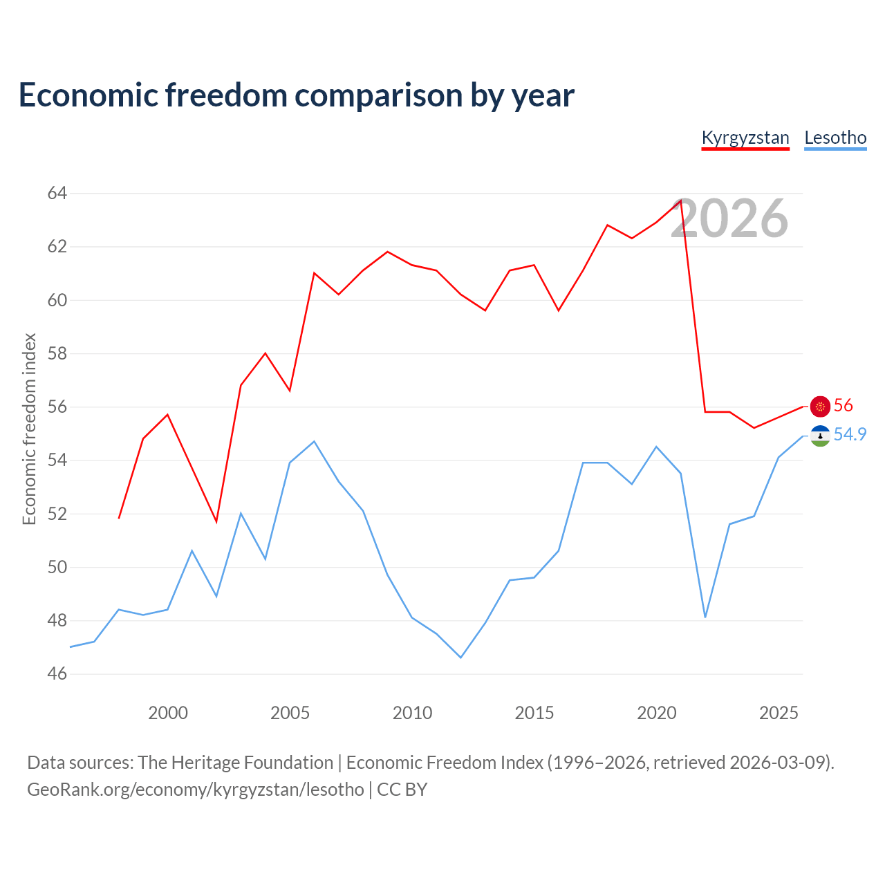 The Economic Freedom Index for Kyrgyzstan is 56, ranking 126/197, compared to 54.9 for Lesotho, ranking 130/197. The chart above displays a comparison of annual changes in economic freedom indexes.