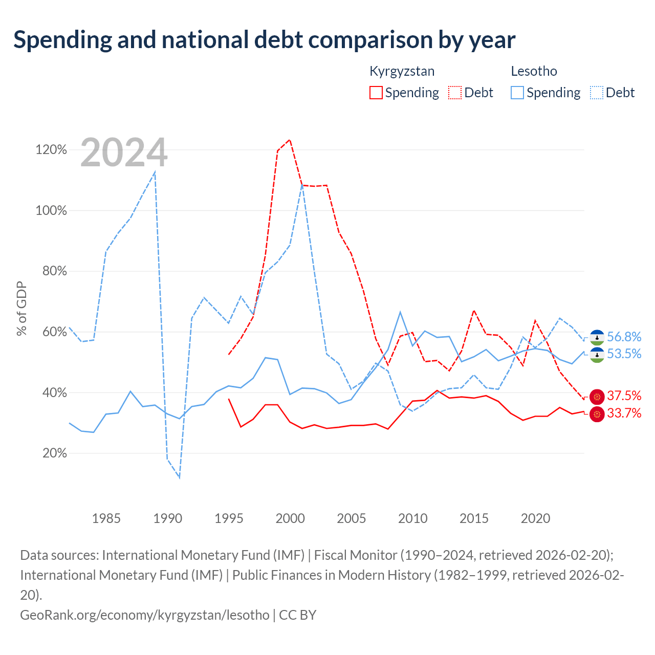 Kyrgyzstan has $6.56B in government debt (37.5% of GDP), compared to $1.29B (56.8% of GDP) in Lesotho.