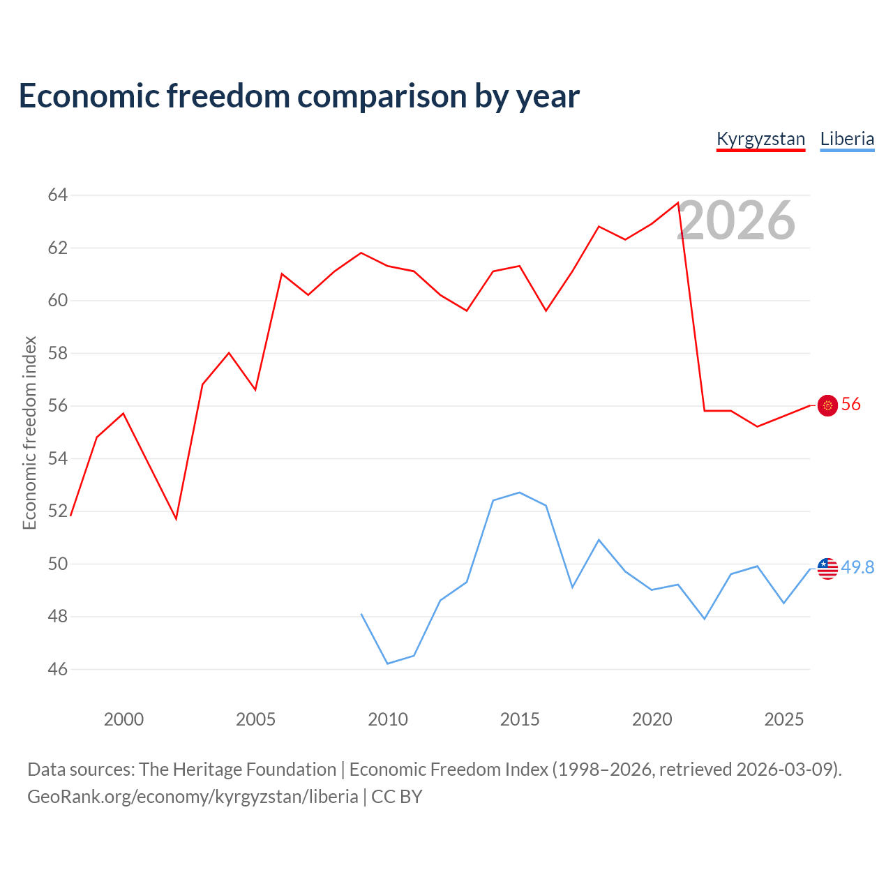 The Economic Freedom Index for Kyrgyzstan is 56, ranking 126/197, compared to 49.8 for Liberia, ranking 163/197. The chart above displays a comparison of annual changes in economic freedom indexes.
