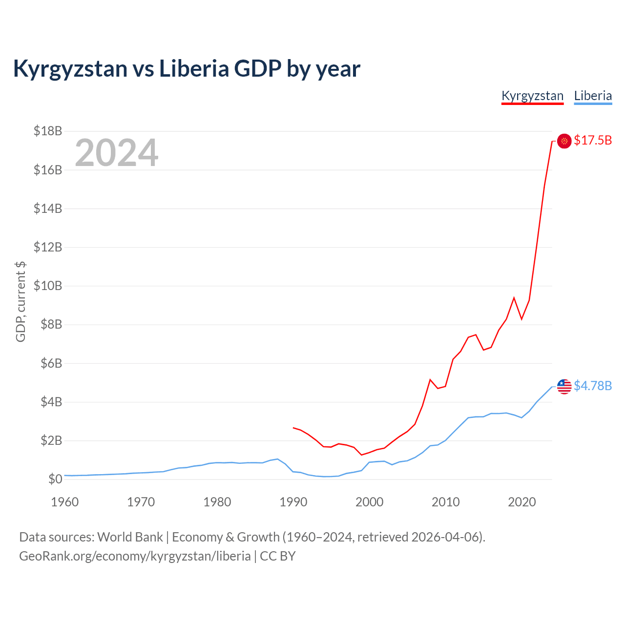 Kyrgyzstan has a GDP of $17.5B compared to $4.78B for Liberia, ranking 135/197 and 163/197 by economy size, respectively.