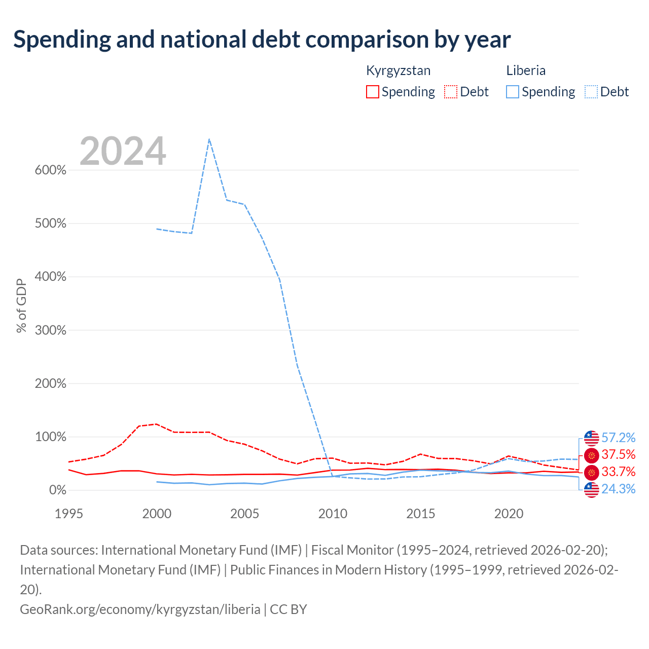 Kyrgyzstan has $6.56B in government debt (37.5% of GDP), compared to $2.73B (57.2% of GDP) in Liberia.