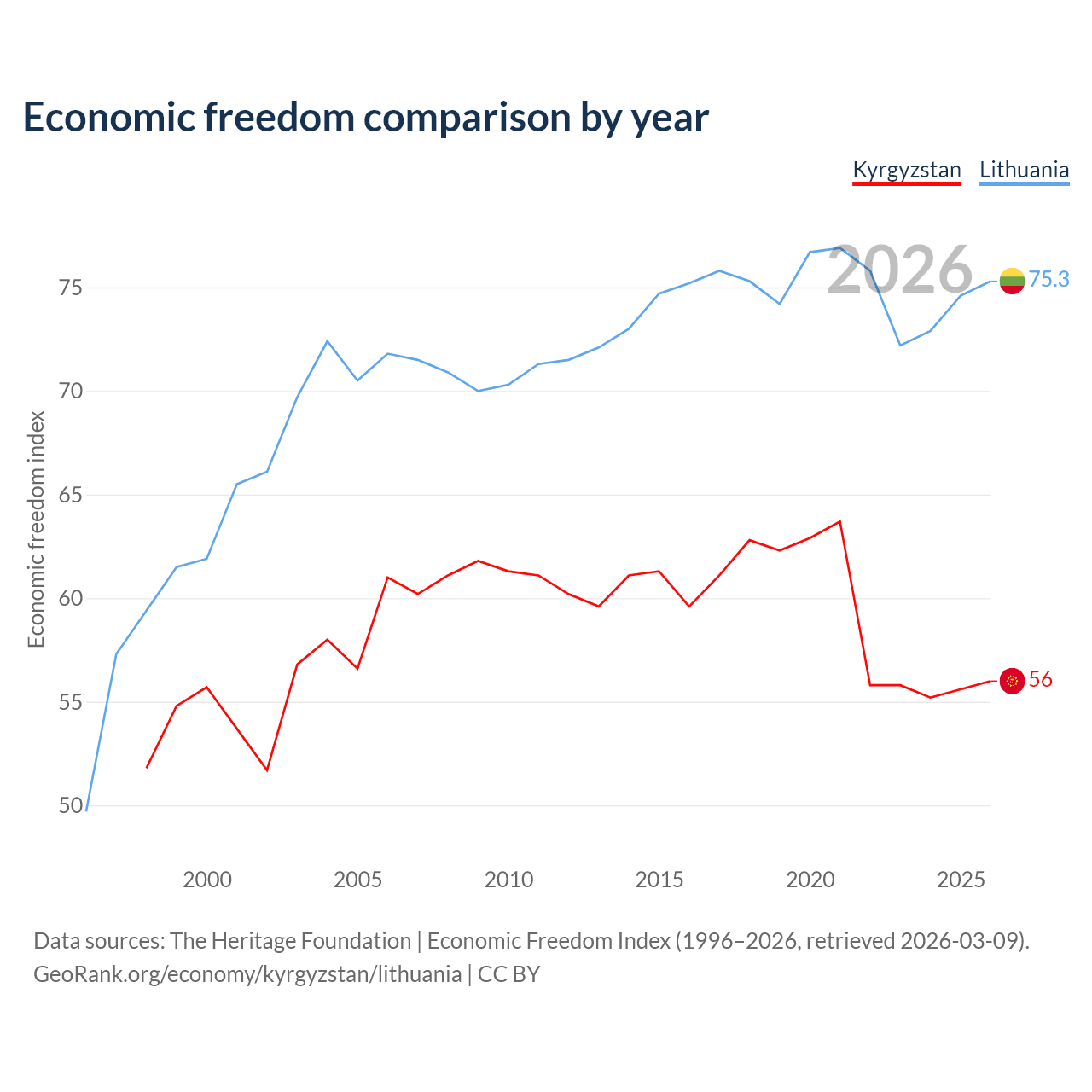 The Economic Freedom Index for Kyrgyzstan is 56, ranking 126/197, compared to 75.3 for Lithuania, ranking 18/197. The chart above displays a comparison of annual changes in economic freedom indexes.