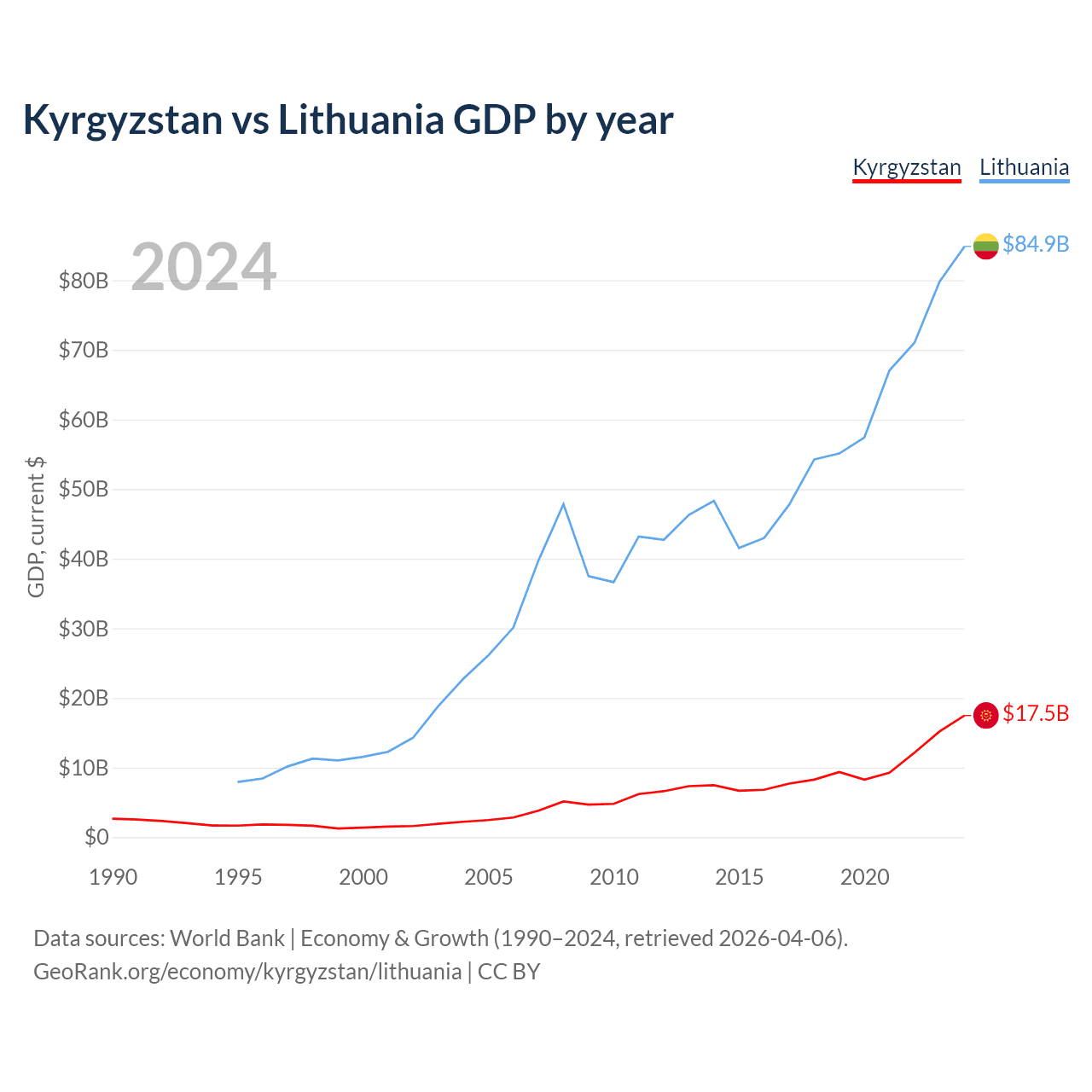 Kyrgyzstan has a GDP of $17.5B compared to $84.9B for Lithuania, ranking 135/197 and 79/197 by economy size, respectively.