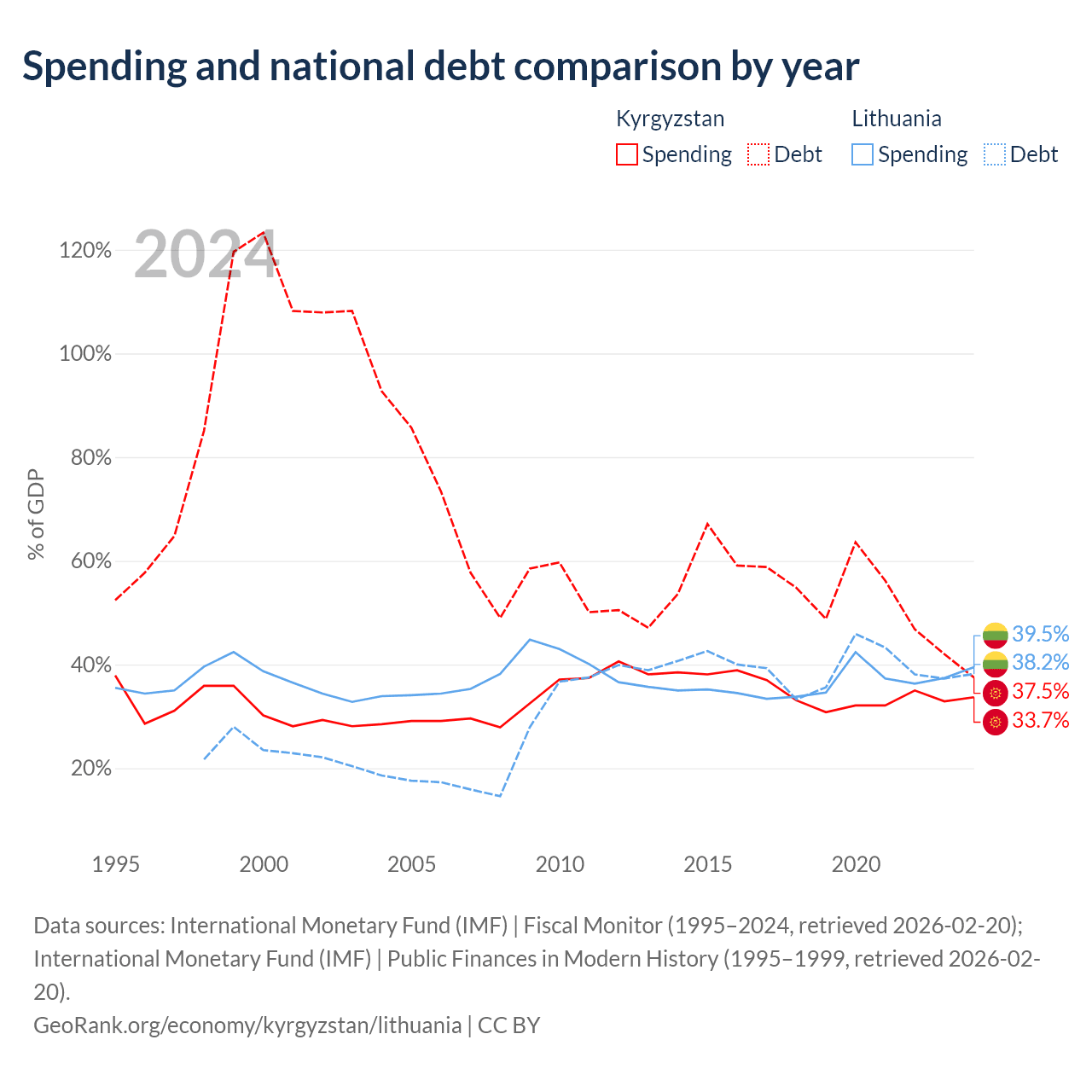 Kyrgyzstan has $6.56B in government debt (37.5% of GDP), compared to $32.4B (38.2% of GDP) in Lithuania.