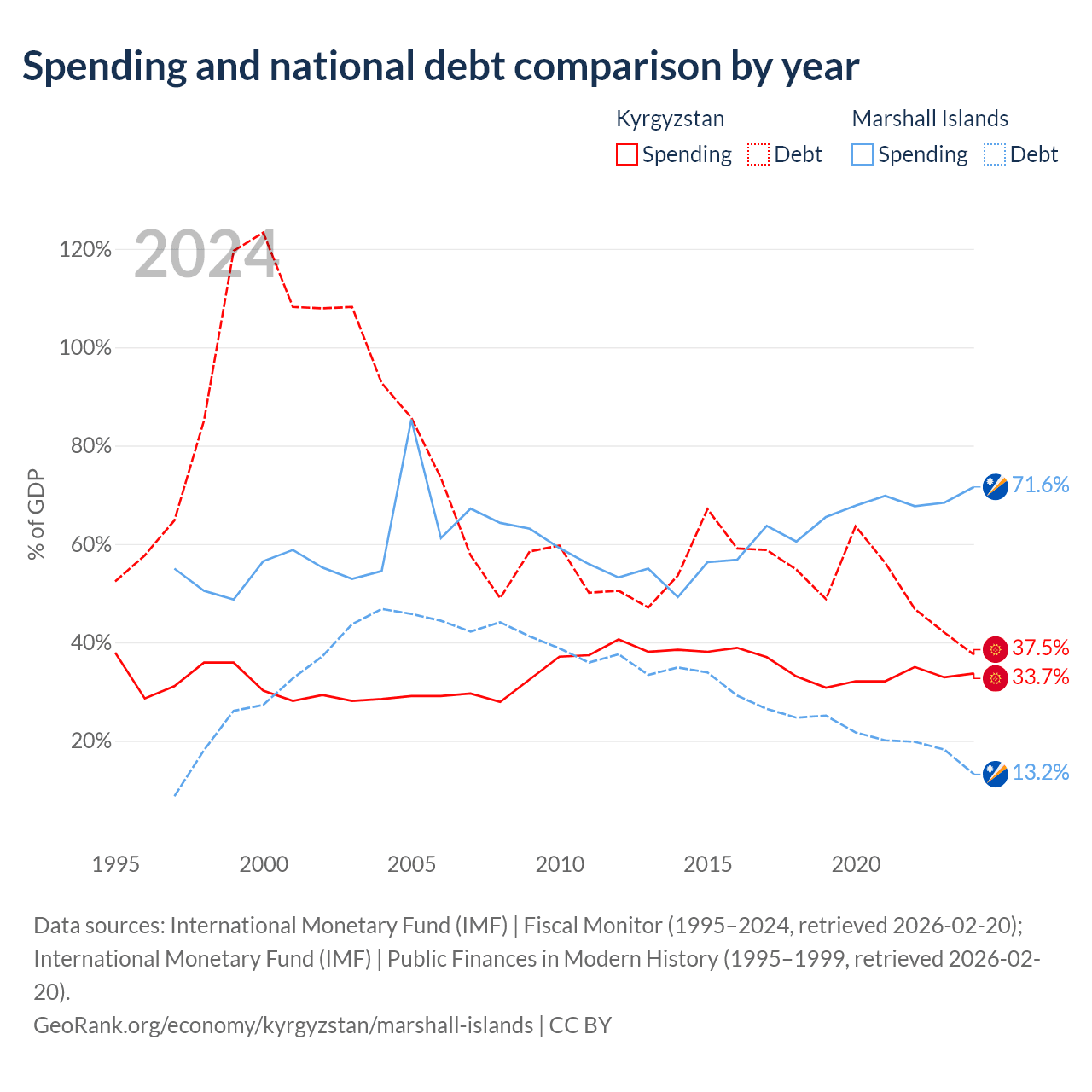 Kyrgyzstan has $6.56B in government debt (37.5% of GDP), compared to $38.4M (13.2% of GDP) in the Marshall Islands.