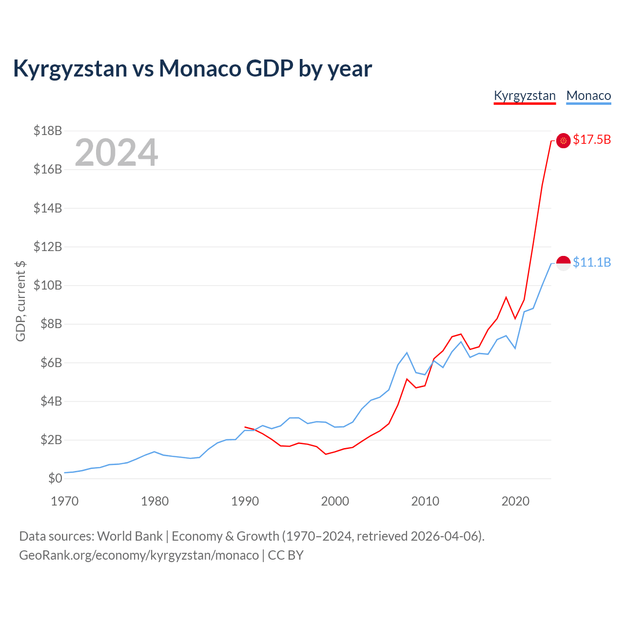 Kyrgyzstan has a GDP of $17.5B compared to $11.1B for Monaco, ranking 135/197 and 152/197 by economy size, respectively.