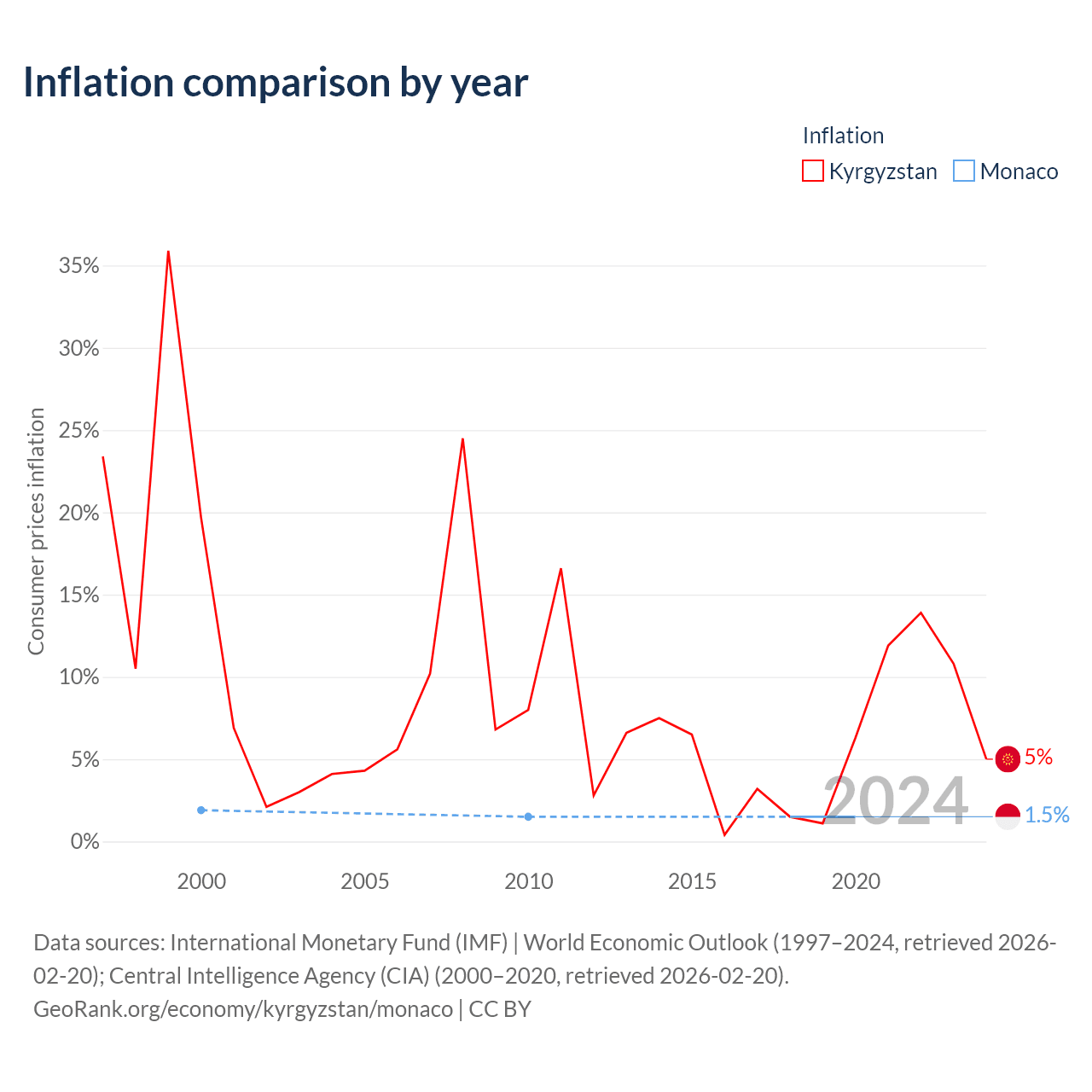 Over the past 21 years, Kyrgyzstan has recorded an average annual inflation rate of 7.03%, compared with 1.58% in Monaco. In 2020, inflation was 5% in Kyrgyzstan and 1.5% in Monaco.