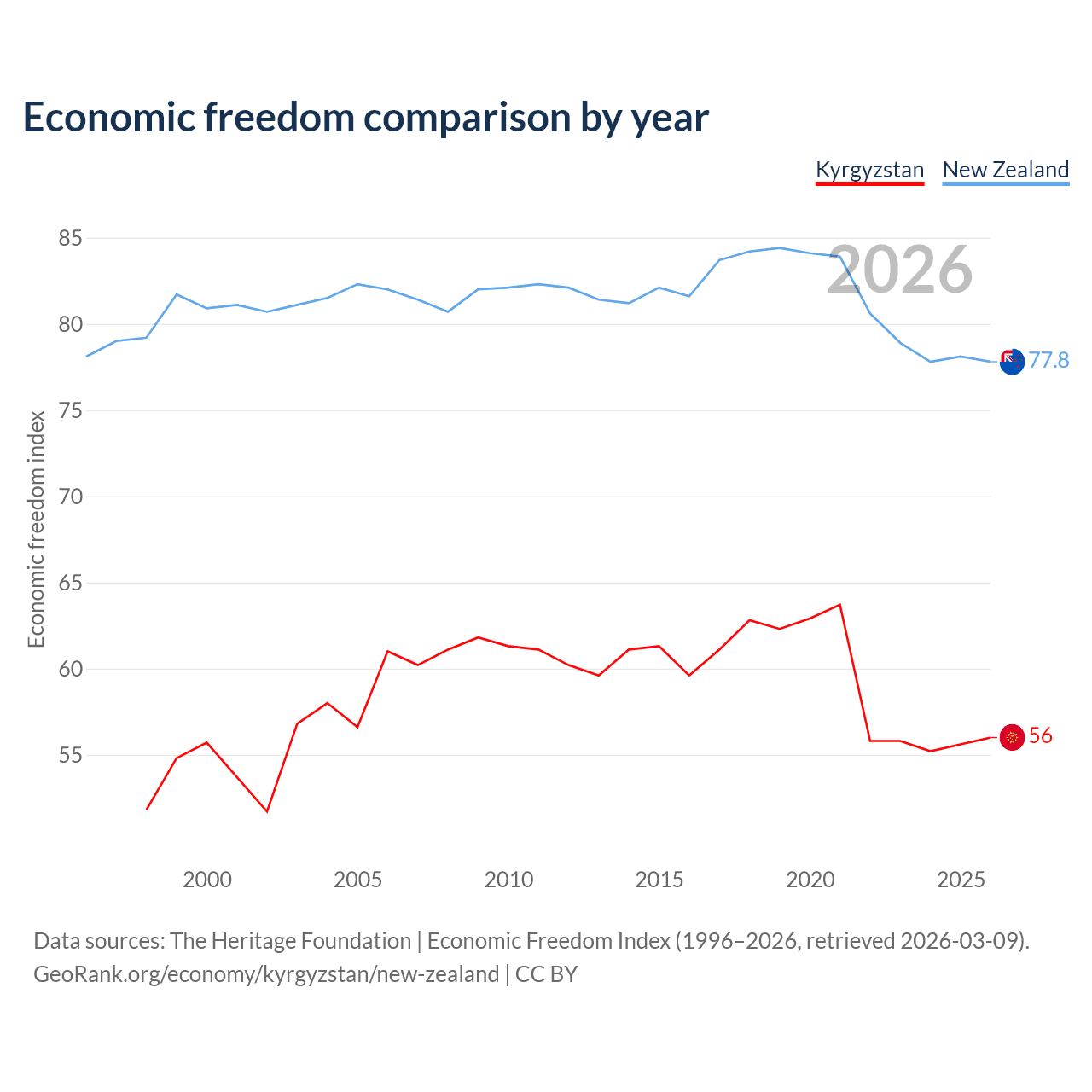 The Economic Freedom Index for Kyrgyzstan is 56, ranking 126/197, compared to 77.8 for New Zealand, ranking 13/197. The chart above displays a comparison of annual changes in economic freedom indexes.