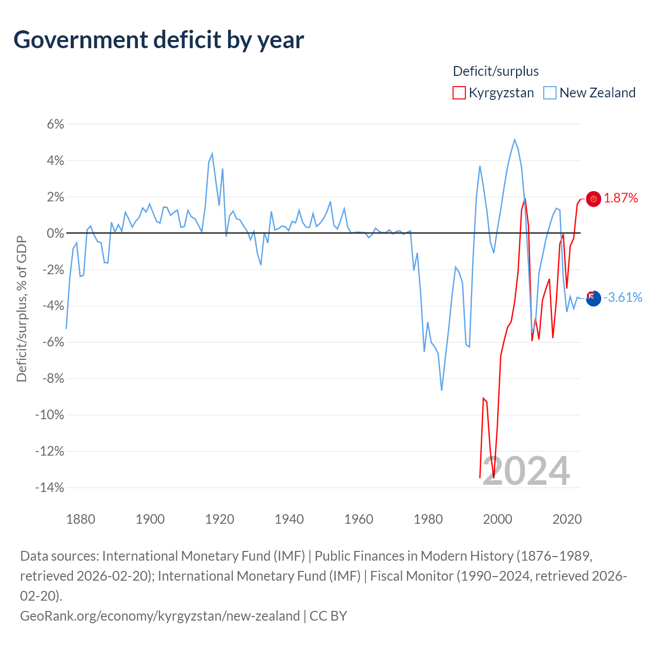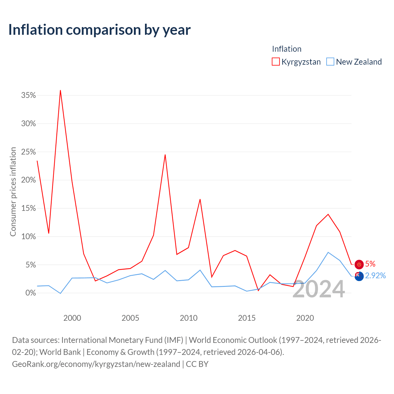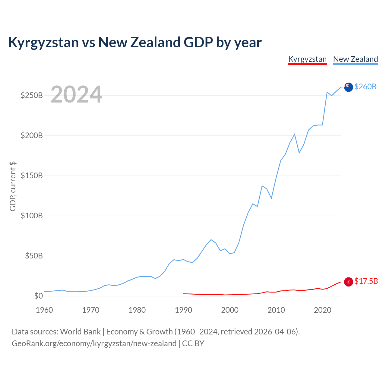 Kyrgyzstan has a GDP of $17.5B compared to $260B for New Zealand, ranking 135/197 and 52/197 by economy size, respectively.