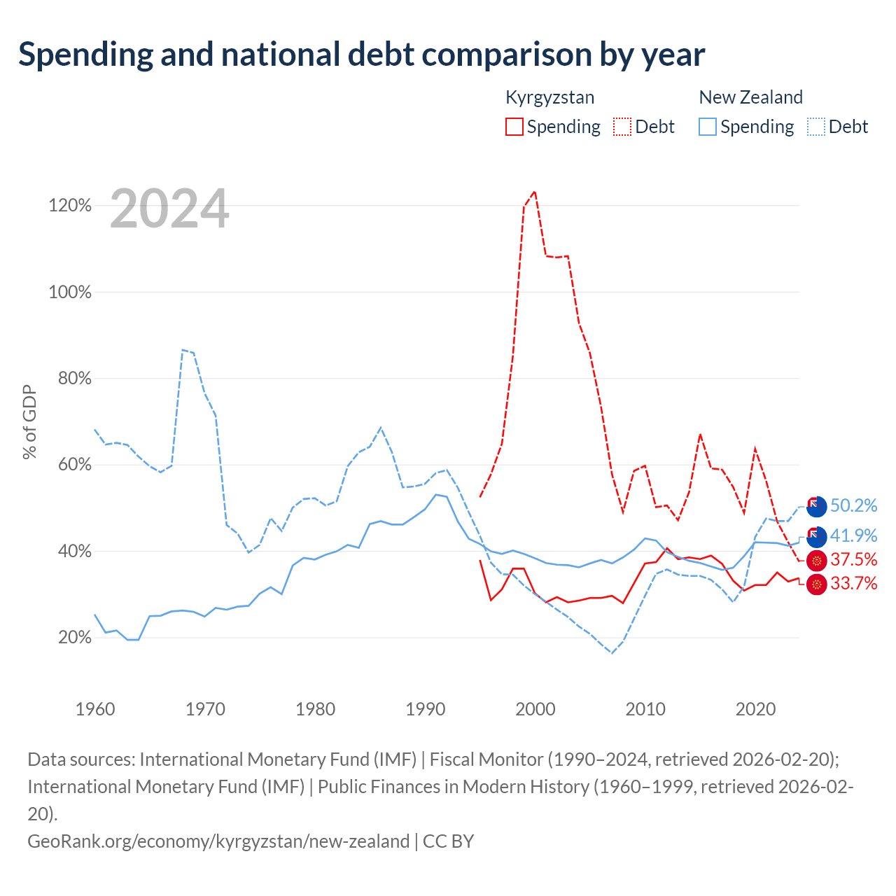 Kyrgyzstan has $6.56B in government debt (37.5% of GDP), compared to $131B (50.2% of GDP) in New Zealand.