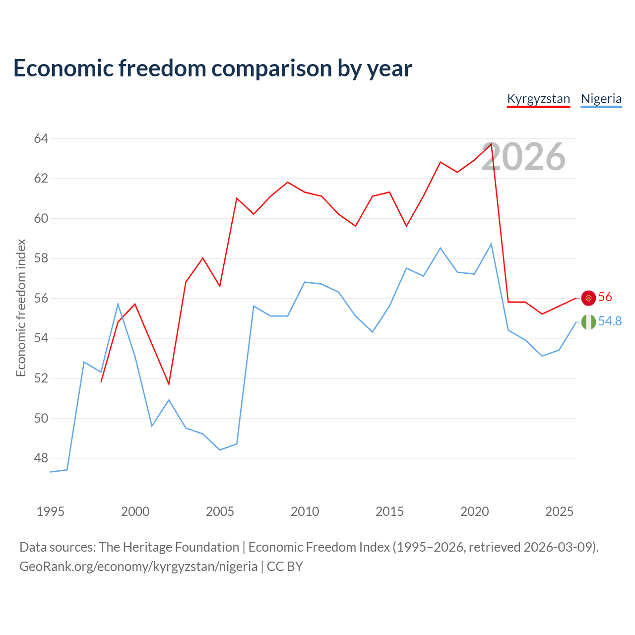 The Economic Freedom Index for Kyrgyzstan is 56, ranking 126/197, compared to 54.8 for Nigeria, ranking 132/197. The chart above displays a comparison of annual changes in economic freedom indexes.