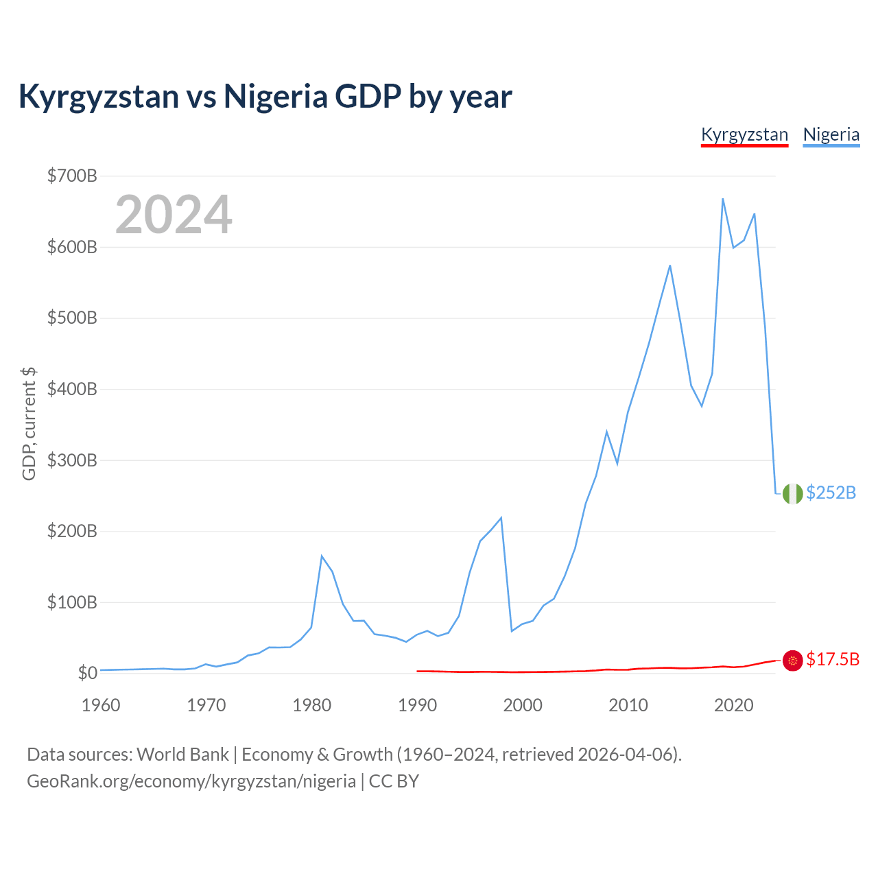 Kyrgyzstan has a GDP of $17.5B compared to $252B for Nigeria, ranking 135/197 and 54/197 by economy size, respectively.