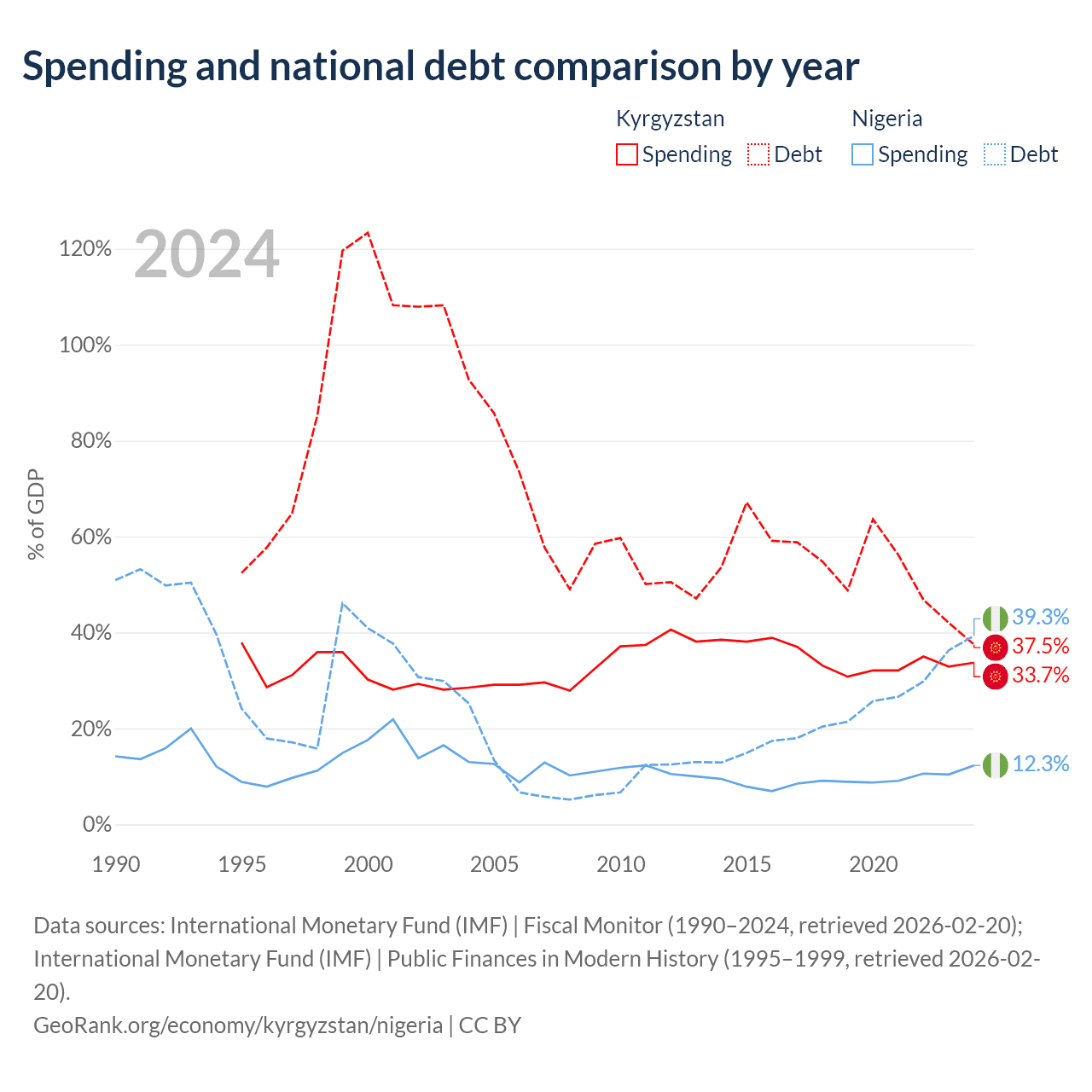Kyrgyzstan has $6.56B in government debt (37.5% of GDP), compared to $99.2B (39.3% of GDP) in Nigeria.