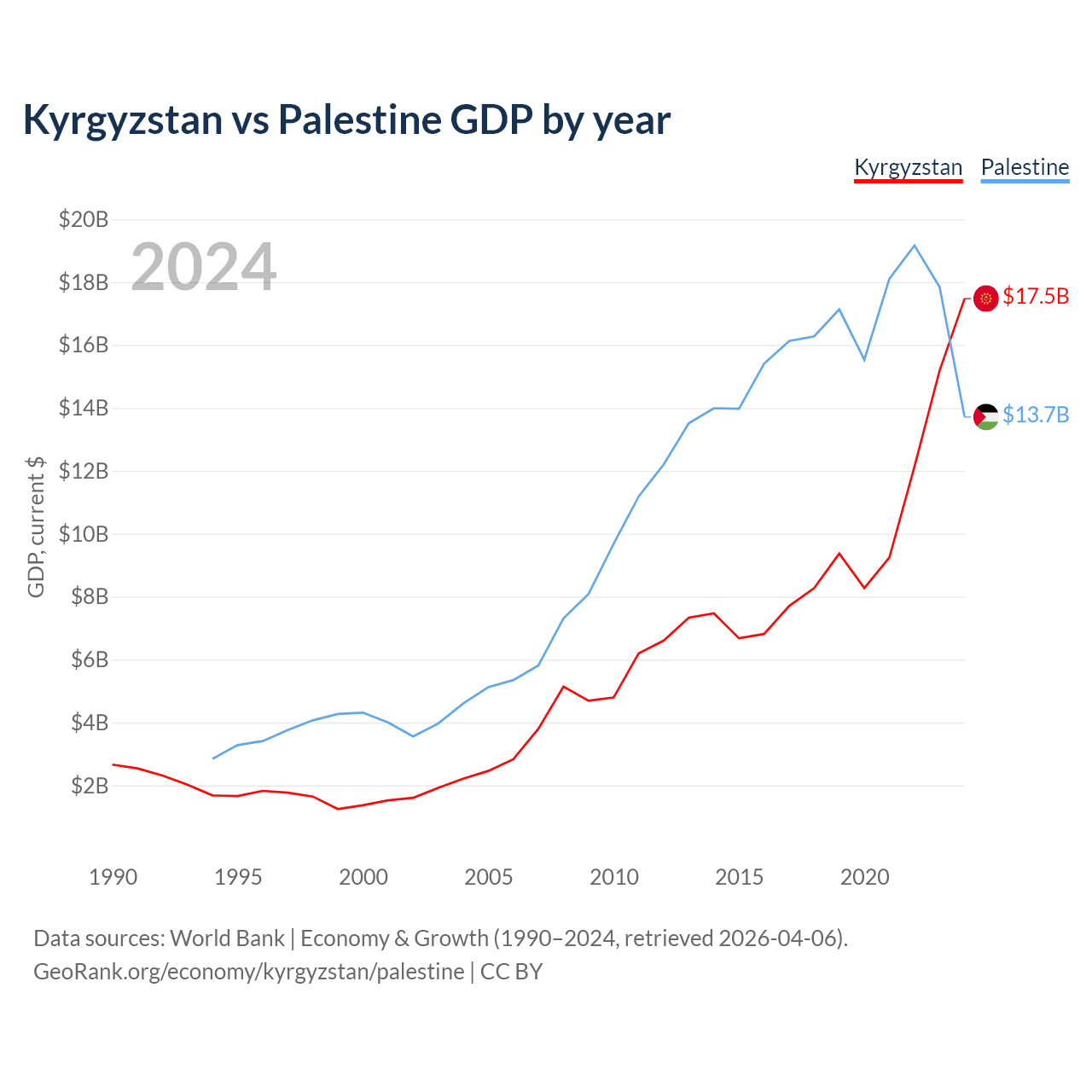 Kyrgyzstan has a GDP of $17.5B compared to $13.7B for Palestine, ranking 135/197 and 146/197 by economy size, respectively.