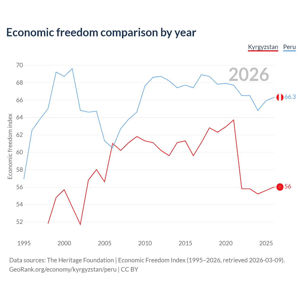 The Economic Freedom Index for Kyrgyzstan is 56, ranking 126/197, compared to 66.3 for Peru, ranking 62/197. The chart above displays a comparison of annual changes in economic freedom indexes.