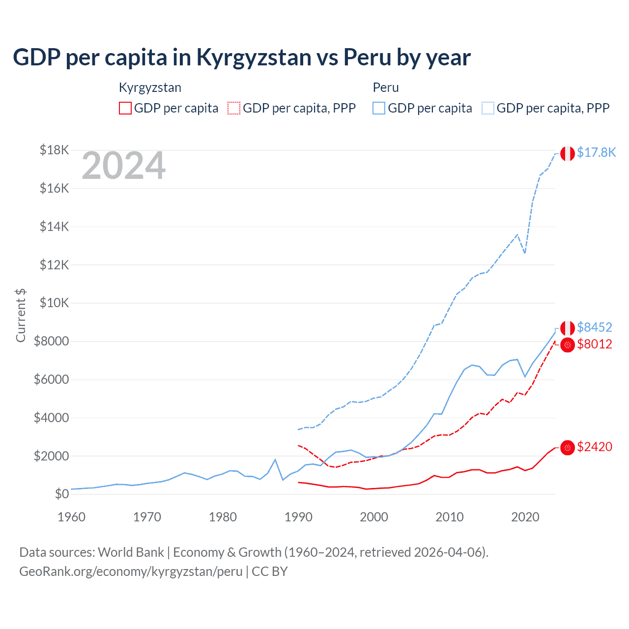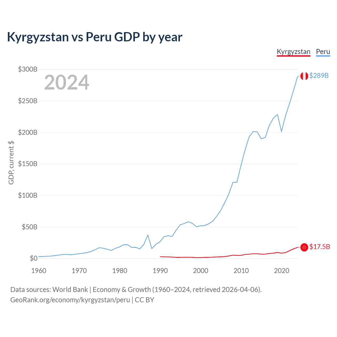 Kyrgyzstan has a GDP of $17.5B compared to $289B for Peru, ranking 135/197 and 49/197 by economy size, respectively.