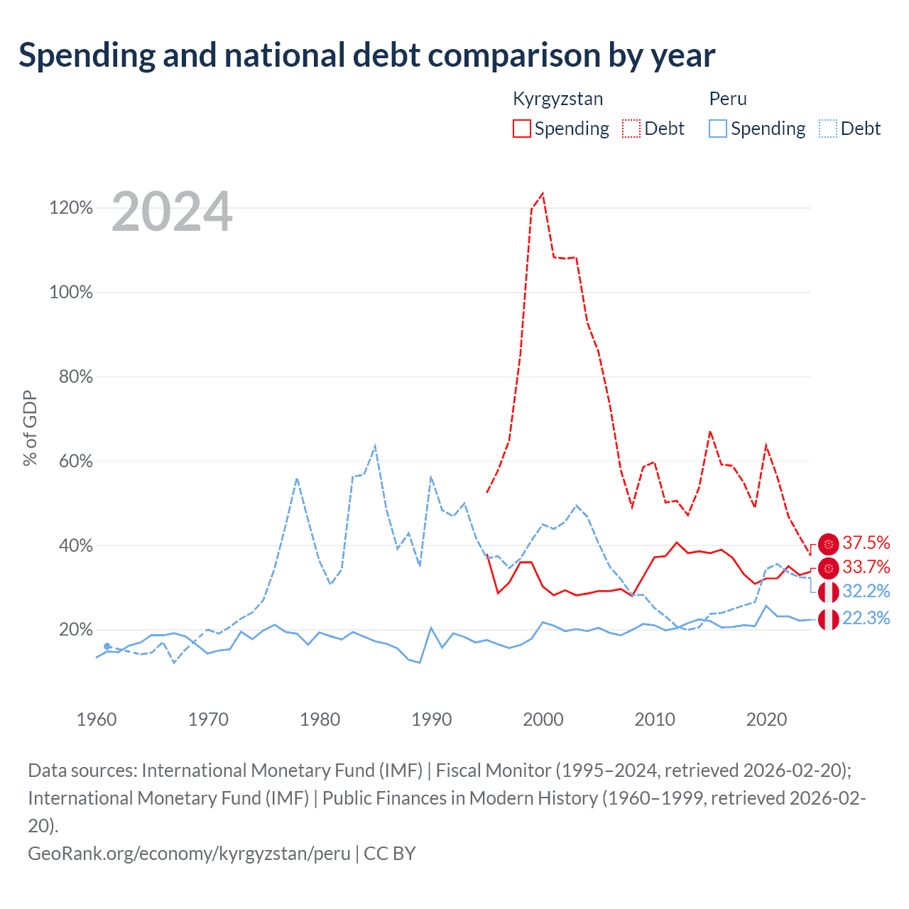 Kyrgyzstan has $6.56B in government debt (37.5% of GDP), compared to $93B (32.2% of GDP) in Peru.