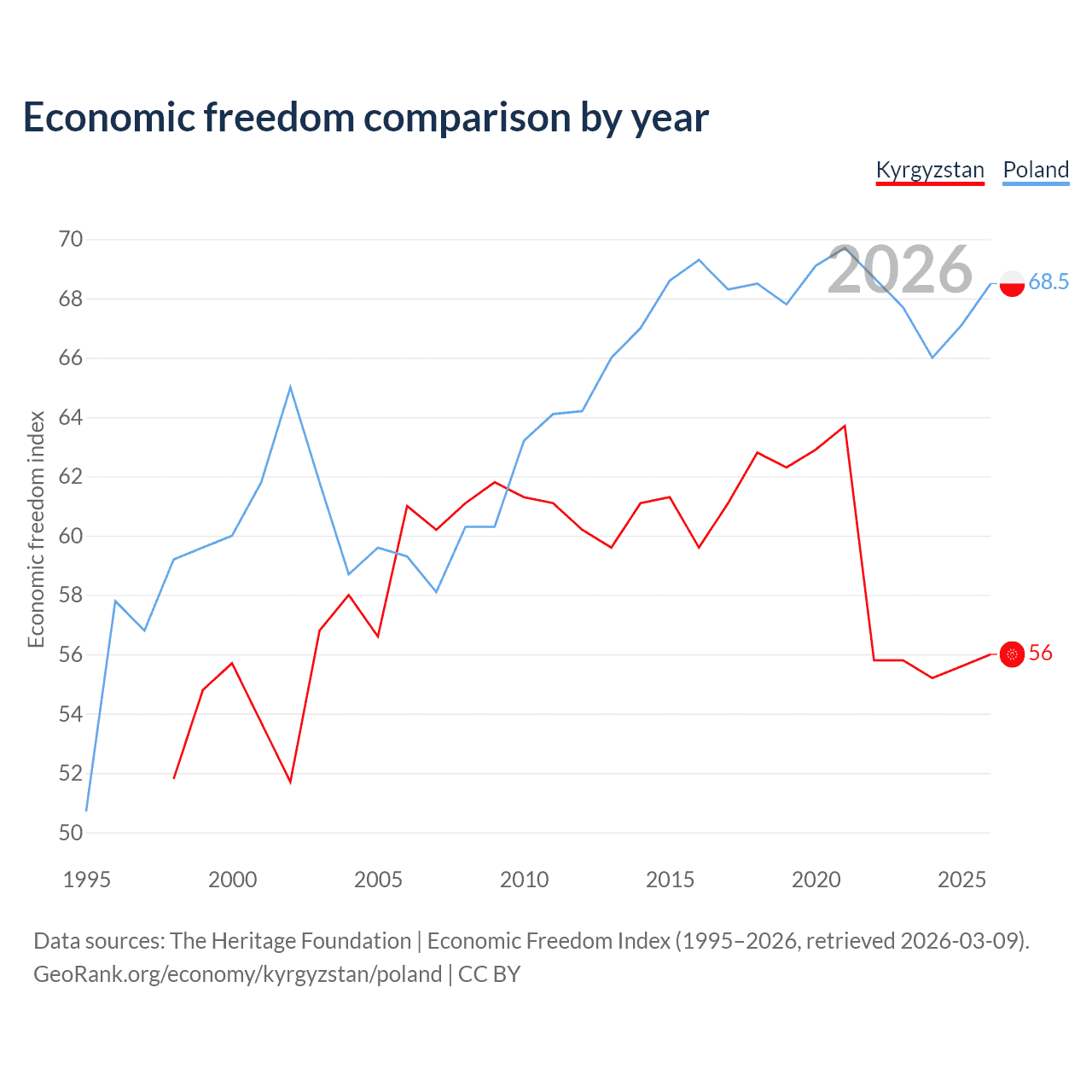 The Economic Freedom Index for Kyrgyzstan is 56, ranking 126/197, compared to 68.5 for Poland, ranking 46/197. The chart above displays a comparison of annual changes in economic freedom indexes.