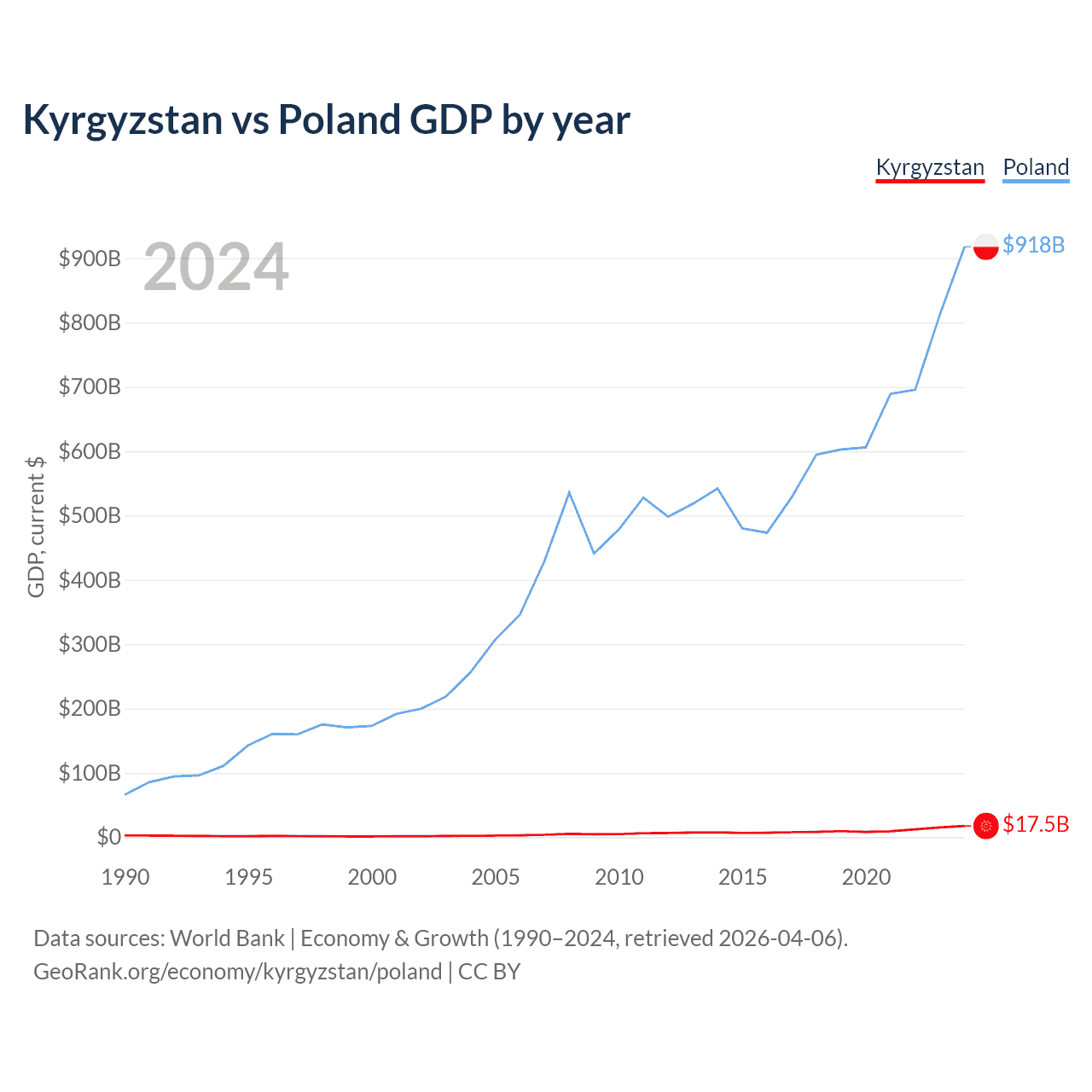 Kyrgyzstan has a GDP of $17.5B compared to $918B for Poland, ranking 135/197 and 21/197 by economy size, respectively.