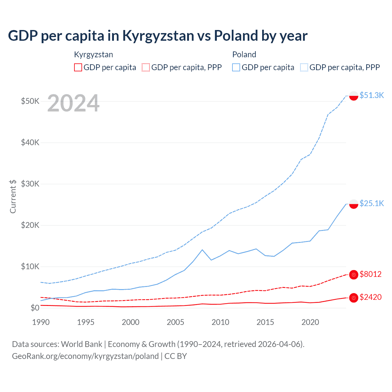 Kyrgyzstan's GDP per capita is $2,420, ranking 150/197, compared to $25,104 in Poland, ranking 48/197. Adjusted for purchasing power (GDP per capita PPP), Kyrgyzstan ranks 141st at $8,012, while Poland ranks 43rd at $51,263.