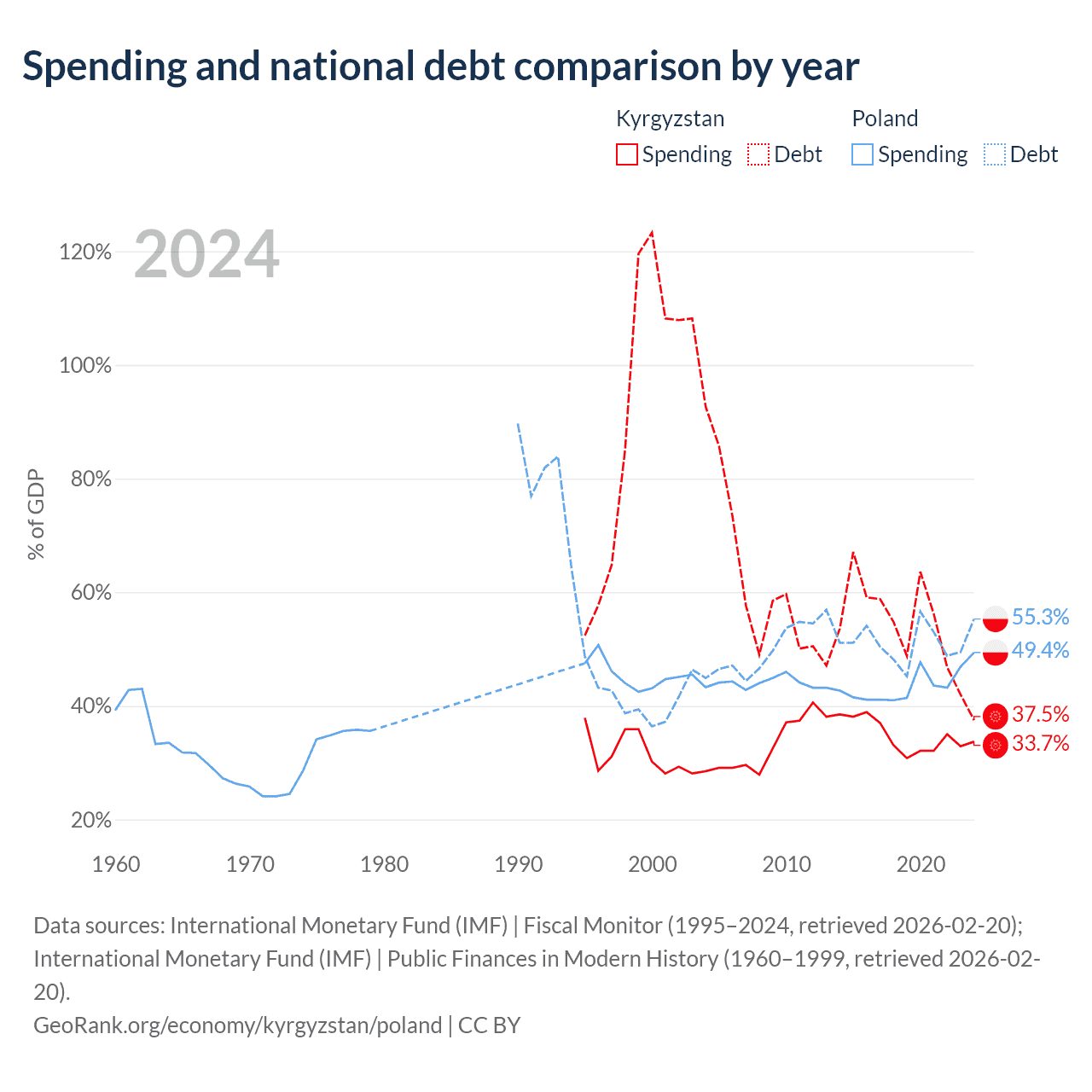 Kyrgyzstan has $6.56B in government debt (37.5% of GDP), compared to $507B (55.3% of GDP) in Poland.