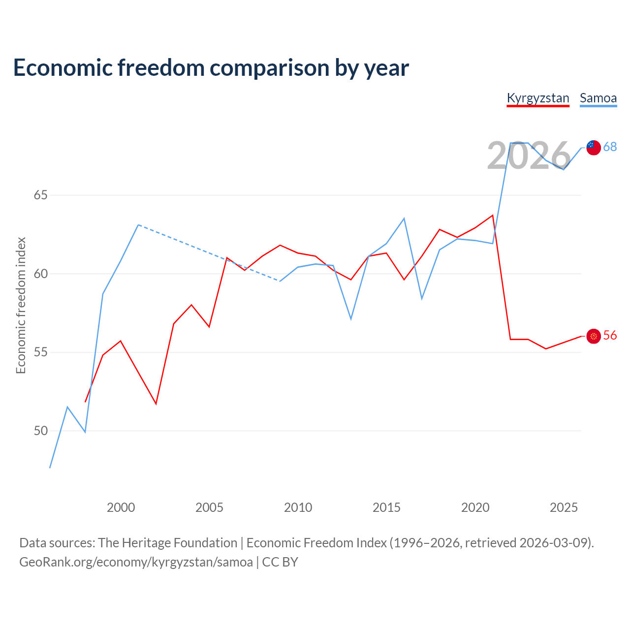 The Economic Freedom Index for Kyrgyzstan is 56, ranking 126/197, compared to 68 for Samoa, ranking 52/197. The chart above displays a comparison of annual changes in economic freedom indexes.