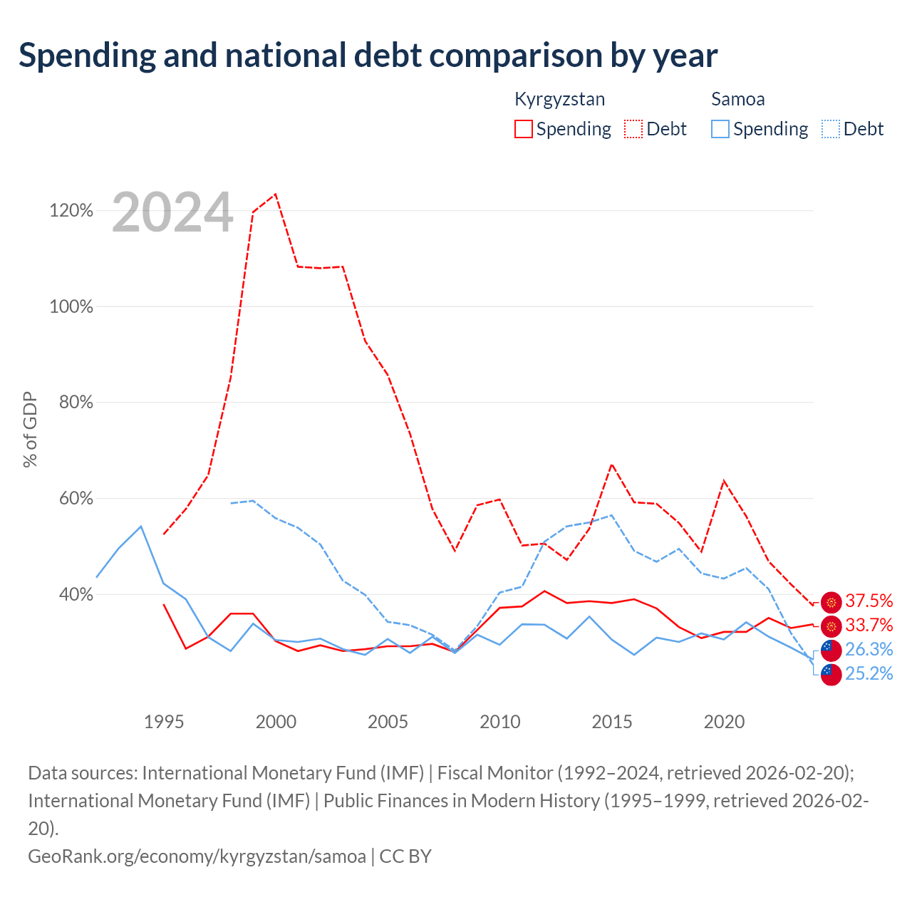 Kyrgyzstan has $6.56B in government debt (37.5% of GDP), compared to $296M (25.2% of GDP) in Samoa.