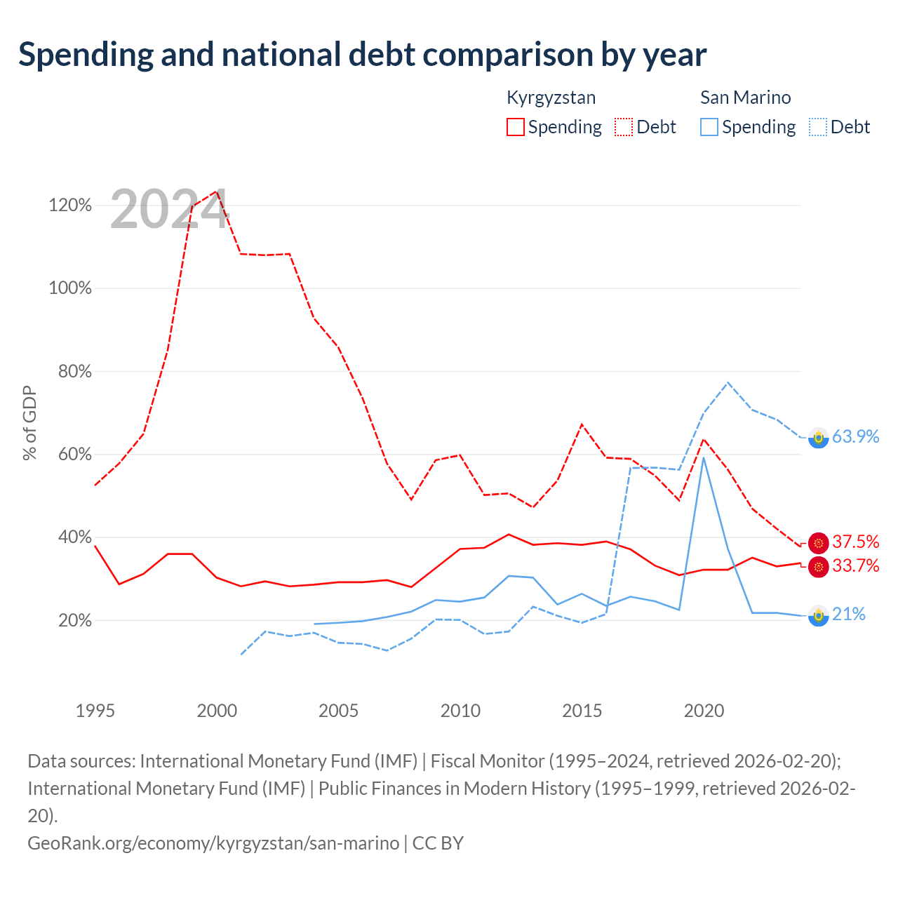 Kyrgyzstan has $6.56B in government debt (37.5% of GDP), compared to $1.39B (63.9% of GDP) in San Marino.