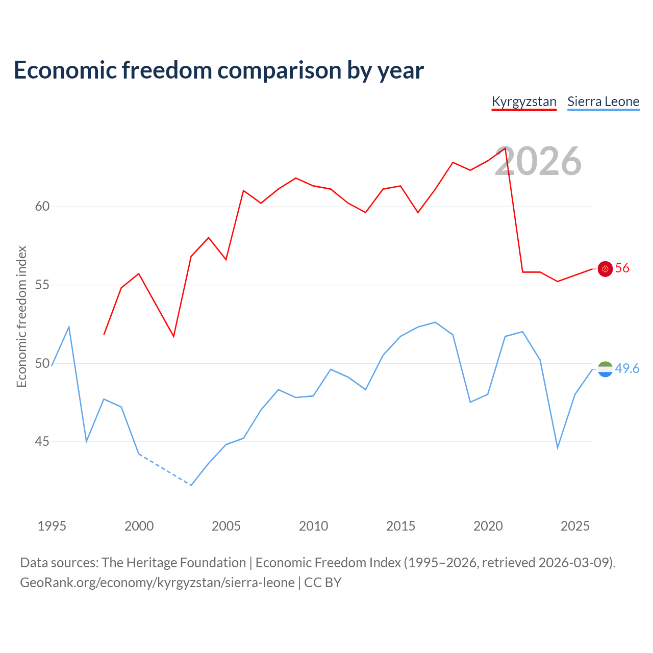 The Economic Freedom Index for Kyrgyzstan is 56, ranking 126/197, compared to 49.6 for Sierra Leone, ranking 165/197. The chart above displays a comparison of annual changes in economic freedom indexes.