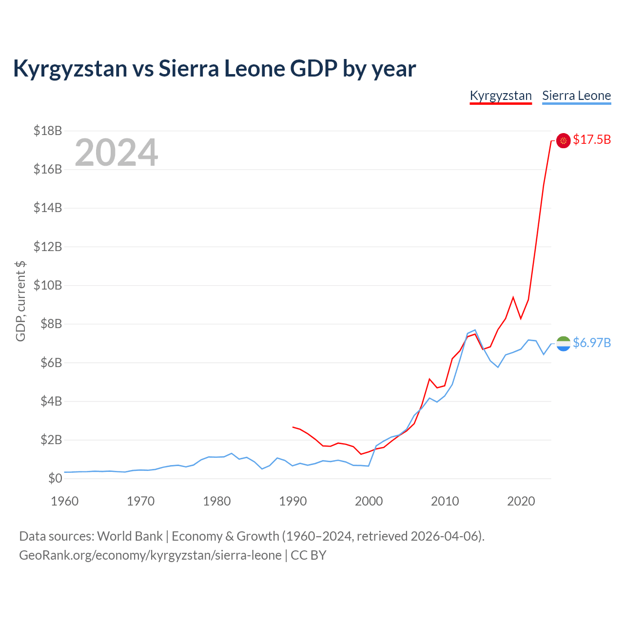 Kyrgyzstan has a GDP of $17.5B compared to $6.97B for Sierra Leone, ranking 135/197 and 160/197 by economy size, respectively.