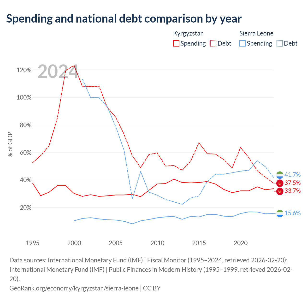 Kyrgyzstan has $6.56B in government debt (37.5% of GDP), compared to $2.91B (41.7% of GDP) in Sierra Leone.