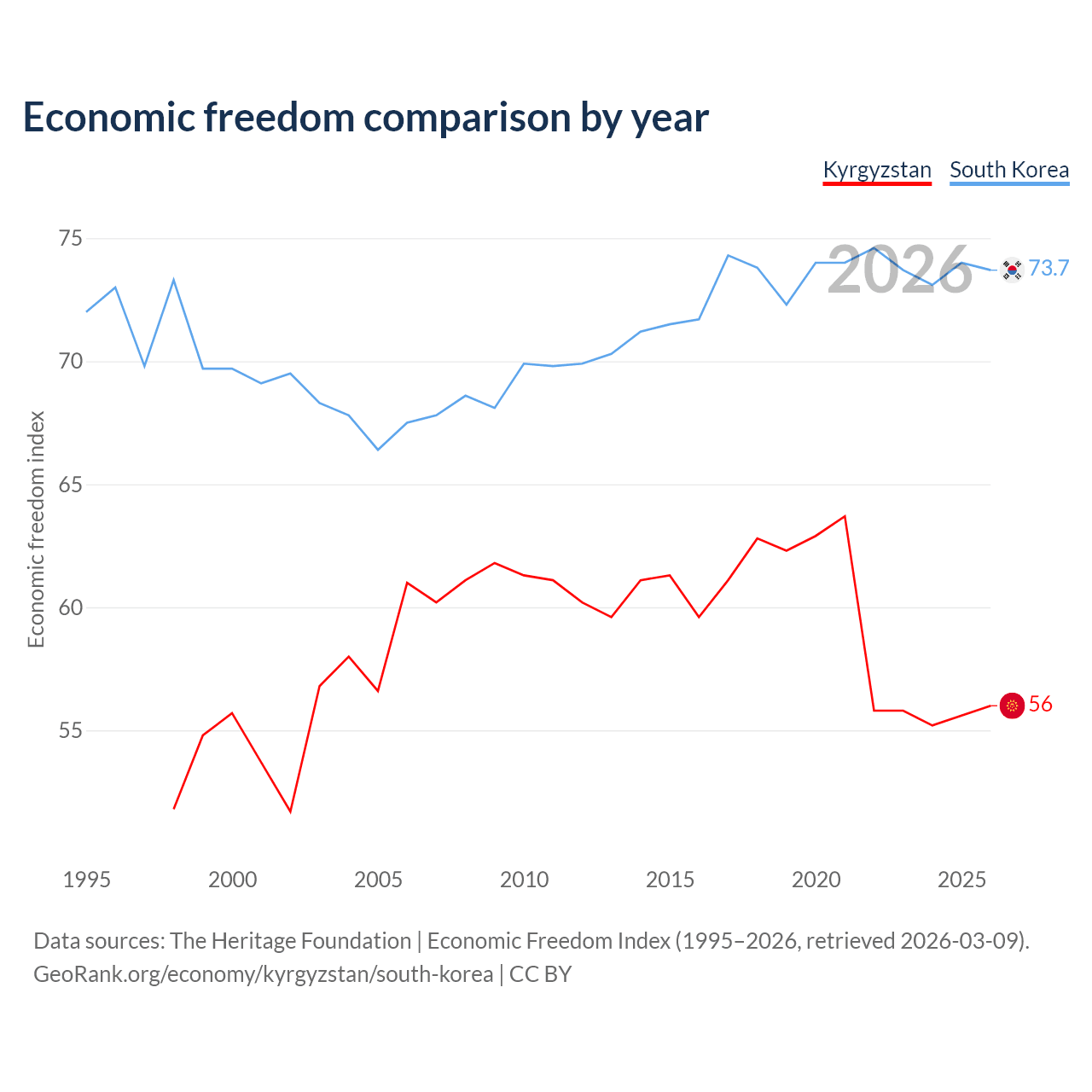 The Economic Freedom Index for Kyrgyzstan is 56, ranking 126/197, compared to 73.7 for South Korea, ranking 24/197. The chart above displays a comparison of annual changes in economic freedom indexes.