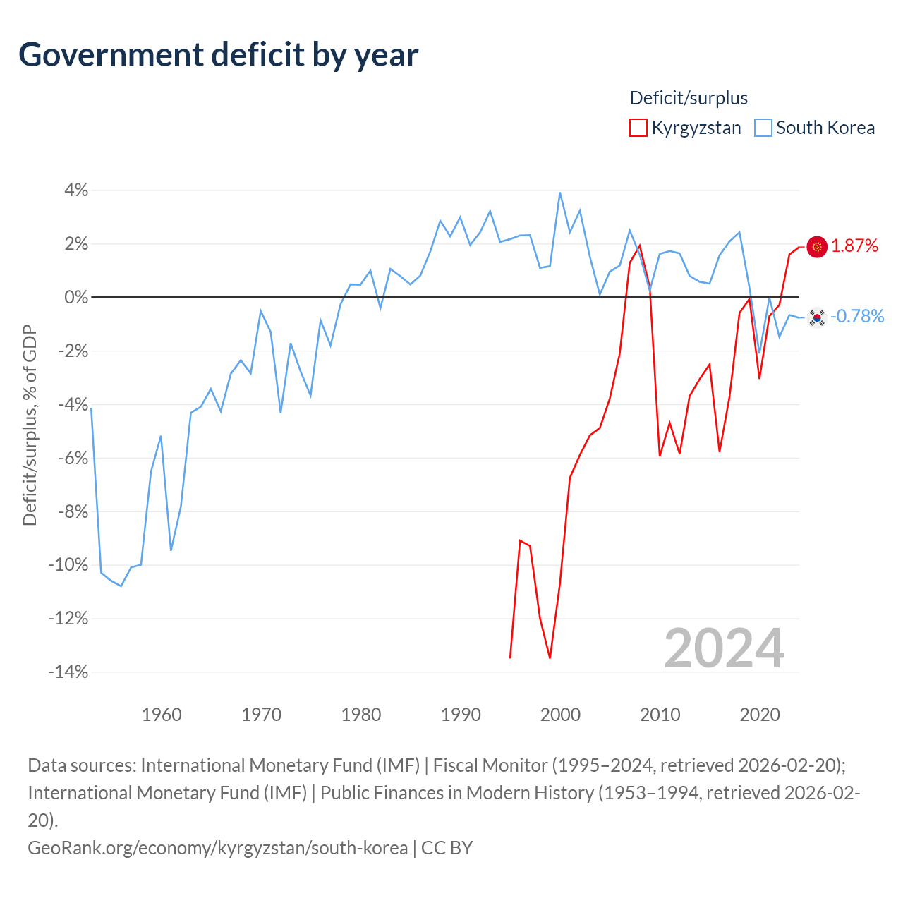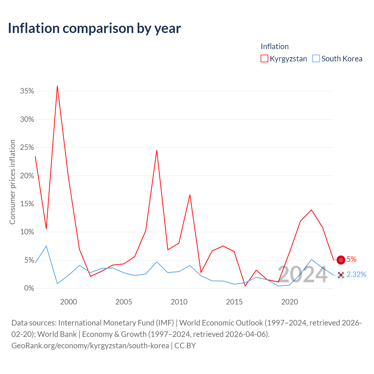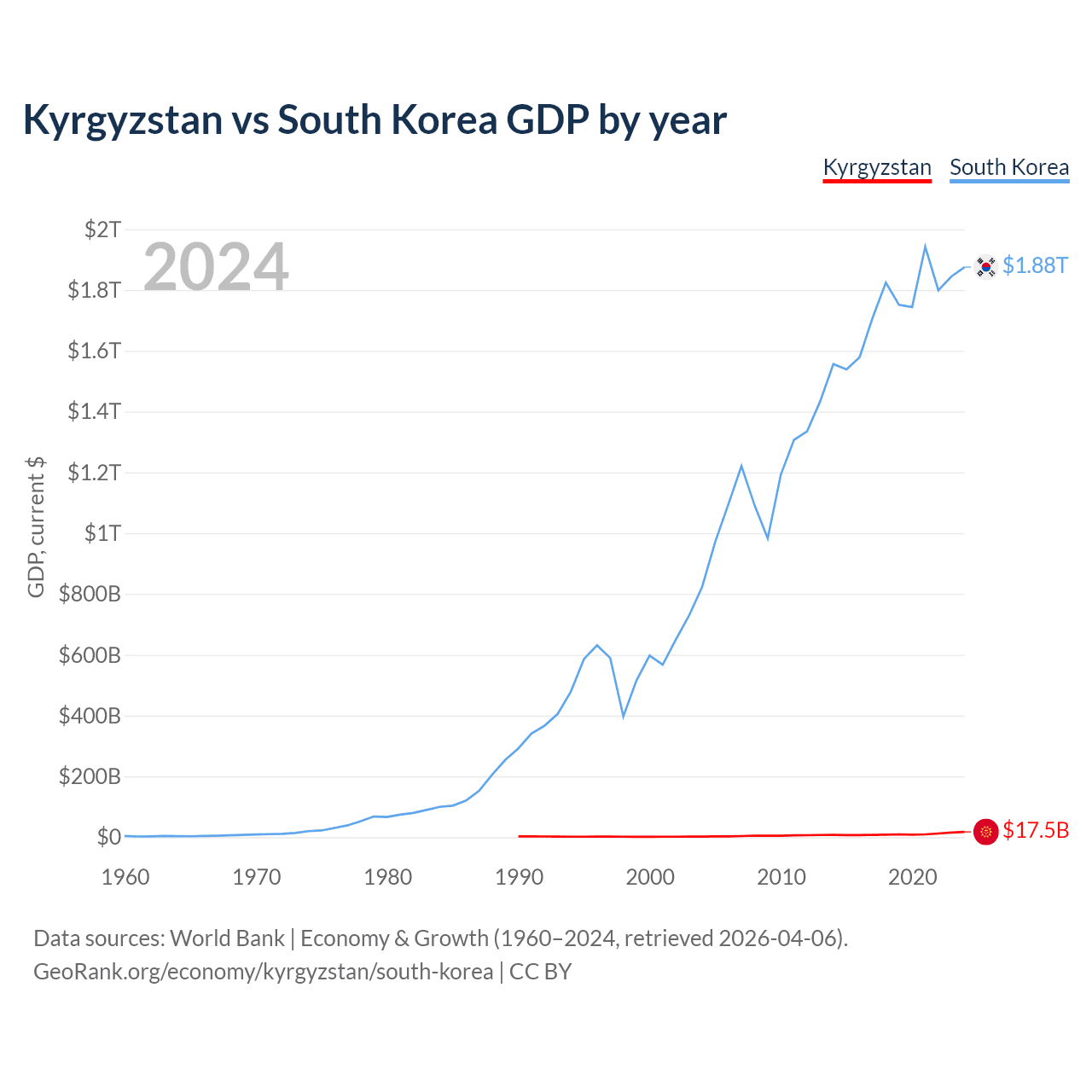 Kyrgyzstan has a GDP of $17.5B compared to $1.88T for South Korea, ranking 135/197 and 12/197 by economy size, respectively.