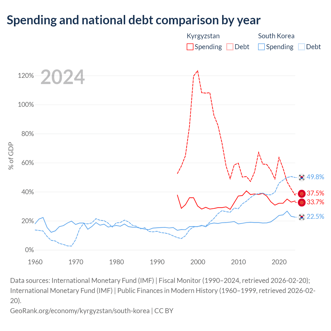 Kyrgyzstan has $6.56B in government debt (37.5% of GDP), compared to $934B (49.8% of GDP) in South Korea.