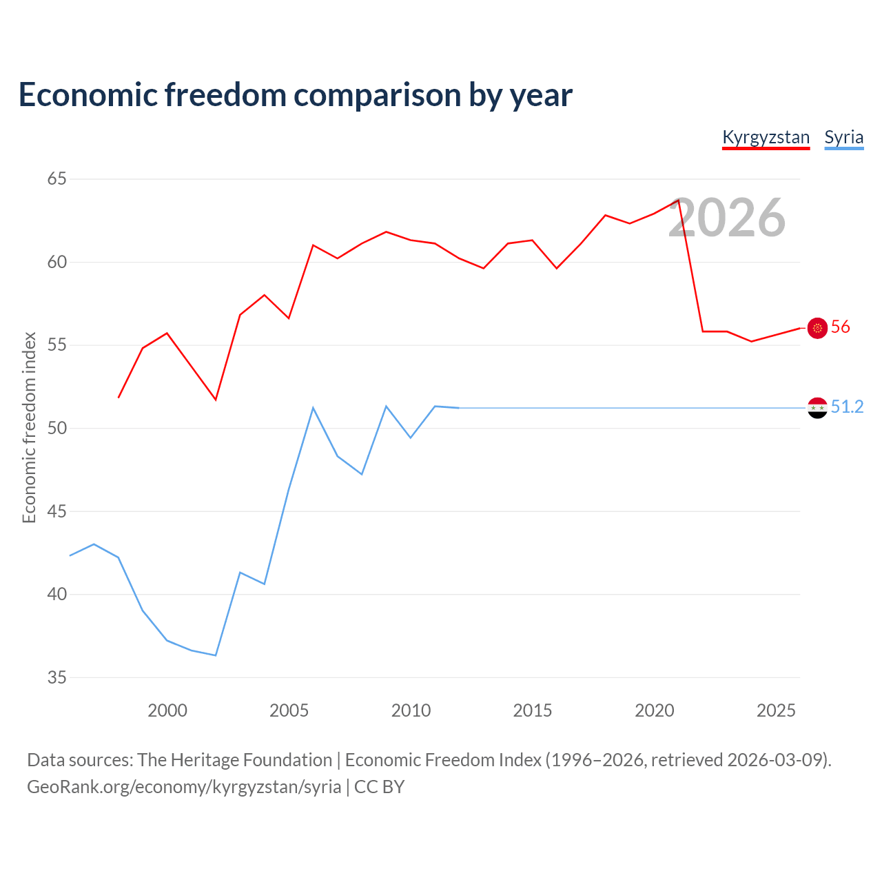 The Economic Freedom Index for Kyrgyzstan is 56, ranking 126/197, compared to 51.2 for Syria, ranking 155/197. The chart above displays a comparison of annual changes in economic freedom indexes.