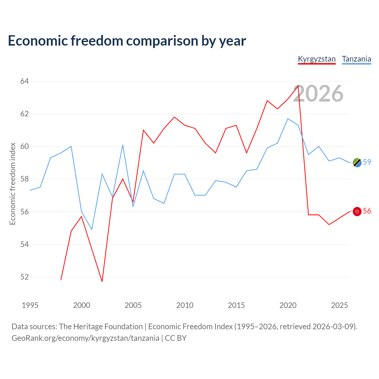 The Economic Freedom Index for Kyrgyzstan is 56, ranking 126/197, compared to 59 for Tanzania, ranking 106/197. The chart above displays a comparison of annual changes in economic freedom indexes.