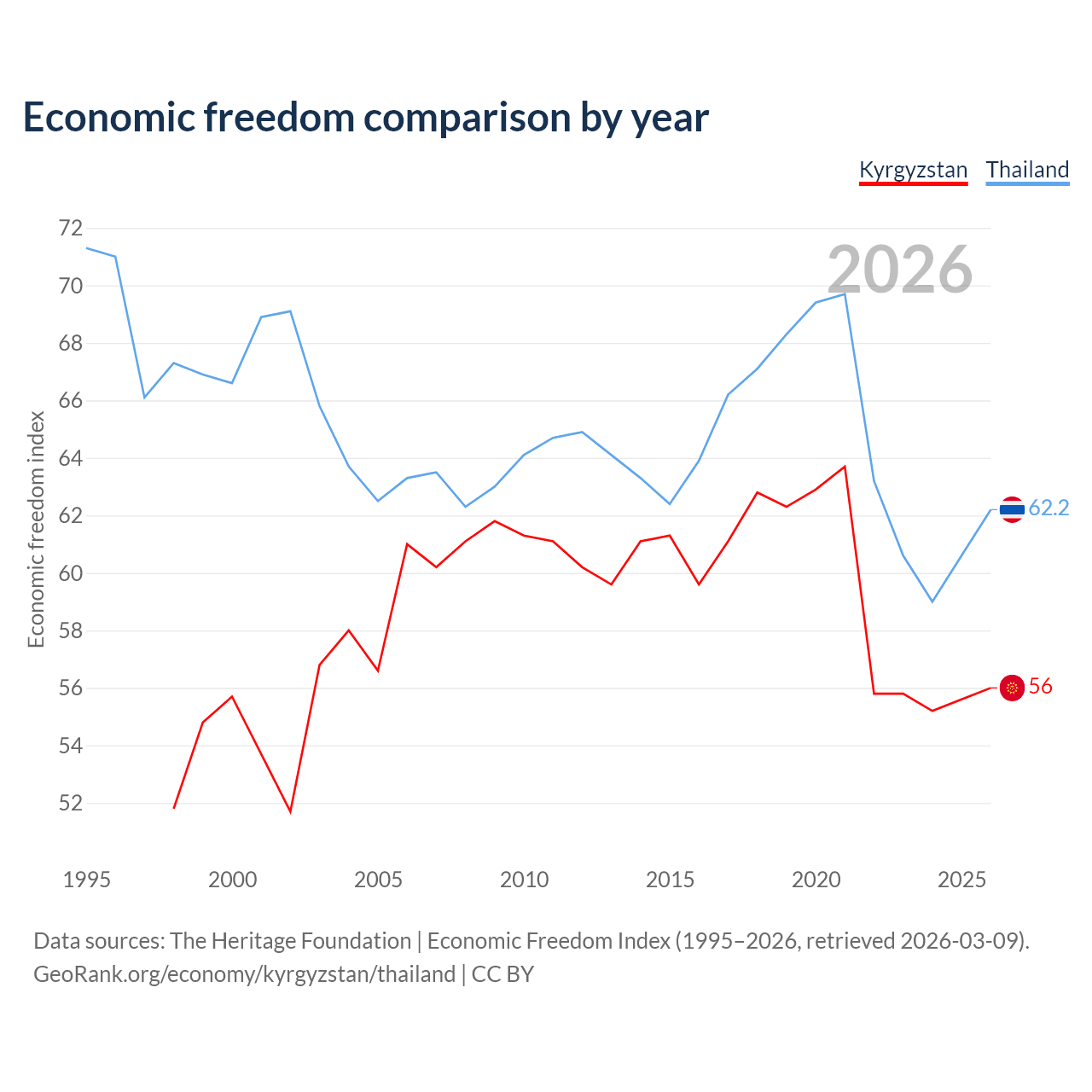 The Economic Freedom Index for Kyrgyzstan is 56, ranking 126/197, compared to 62.2 for Thailand, ranking 88/197. The chart above displays a comparison of annual changes in economic freedom indexes.