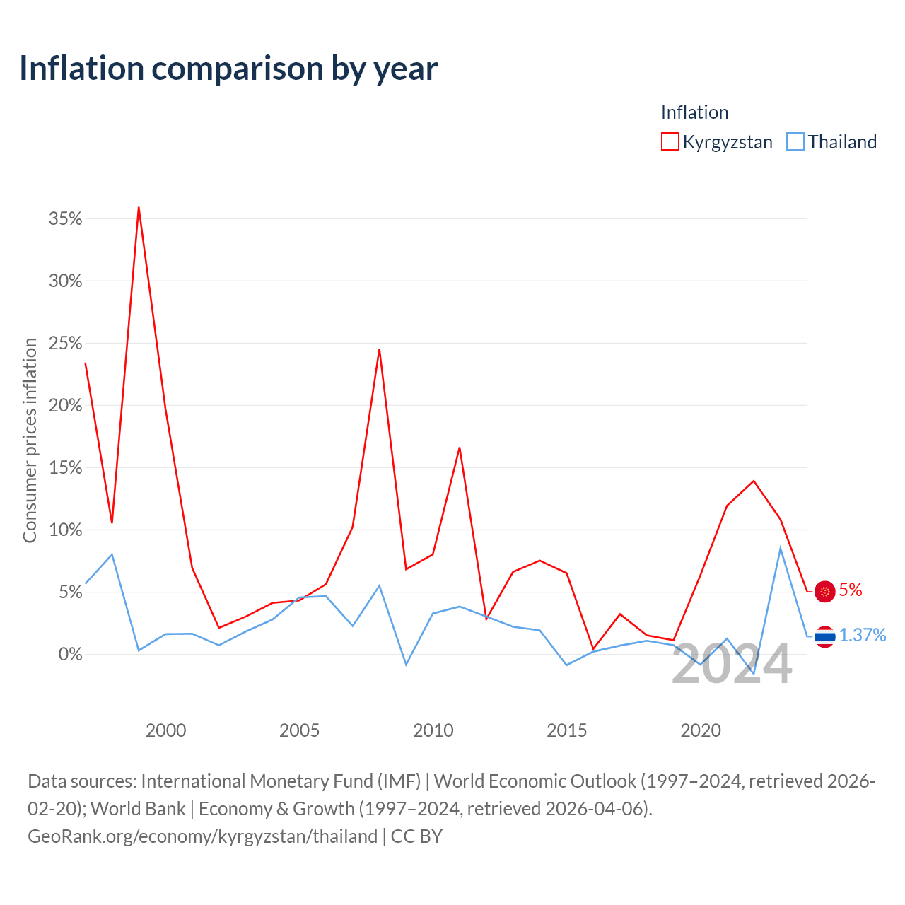 Kyrgyzstan has a GDP of $17.5B compared to $527B for Thailand, ranking 135/197 and 31/197 by economy size, respectively.